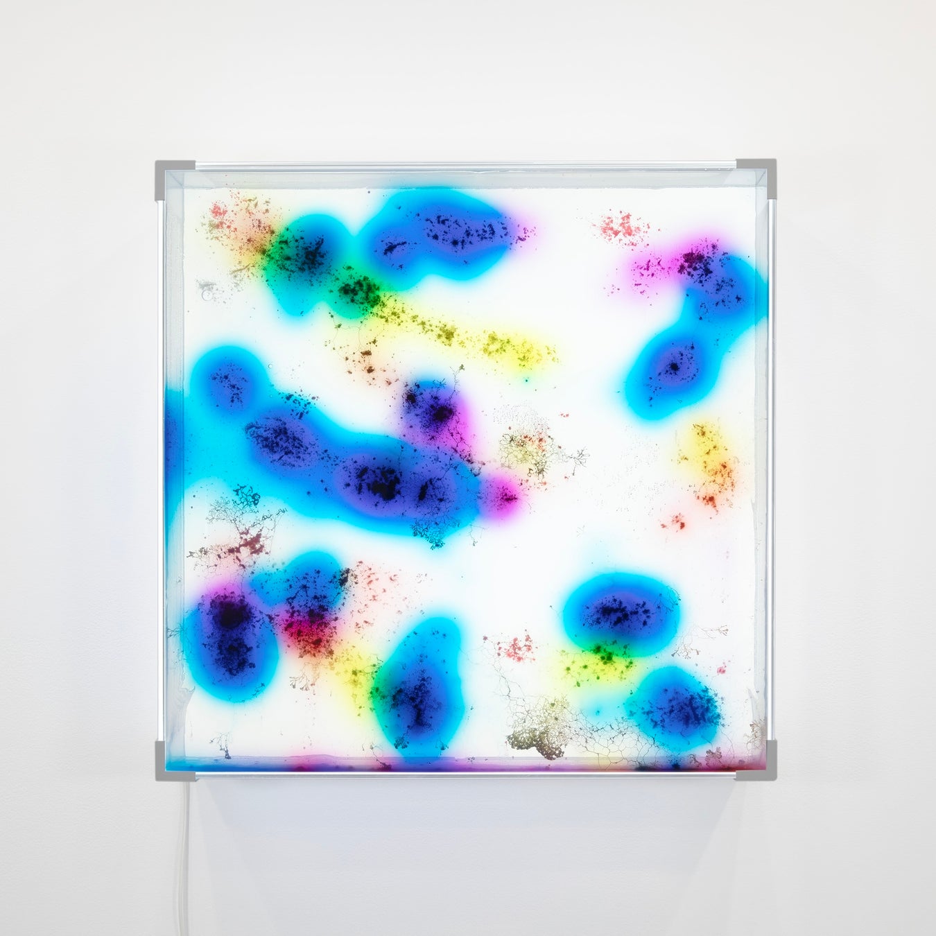 会期中、展示される一部の作品では真性粘菌が生きたまま活動を続けており、真性粘菌と齋藤の関わりの中で展示形態が変化していくことも本展の見どころの一つです。会期序盤の展示風景はさながら真性粘菌の培養工場のように見えるかもしれません。会期中盤には齋藤が真性粘菌の培地をアート作品として壁面に飾っていきます。展示や販売といった人間側の経済活動もまた、作品の一部として位置付けられています。齋藤は、真性粘菌をアートに用いる行為そのものが“搾取”や“暴力”と見なされる可能性を自覚していますが、本展ディレクターの磯村は、逆に齋藤が作品のために真性粘菌を養い続けざるを得ない可能性も開かれている と考えており、人間と自然との主従関係を問い直しています。