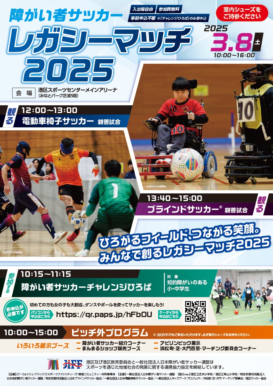 2025年3月8日(土)にピーウォッシュ・アシックススポーツファシリティーズ・東急コミュニティー共同事業体主催、一般社団法人日本障がい者サッカー連盟(JIFF)主管、みなとパーク芝浦フェスティバル内で「障がい者サッカーレガシーマッチ2025」を港区スポーツセンターメインアリーナ(東京都港区)にて開催します。