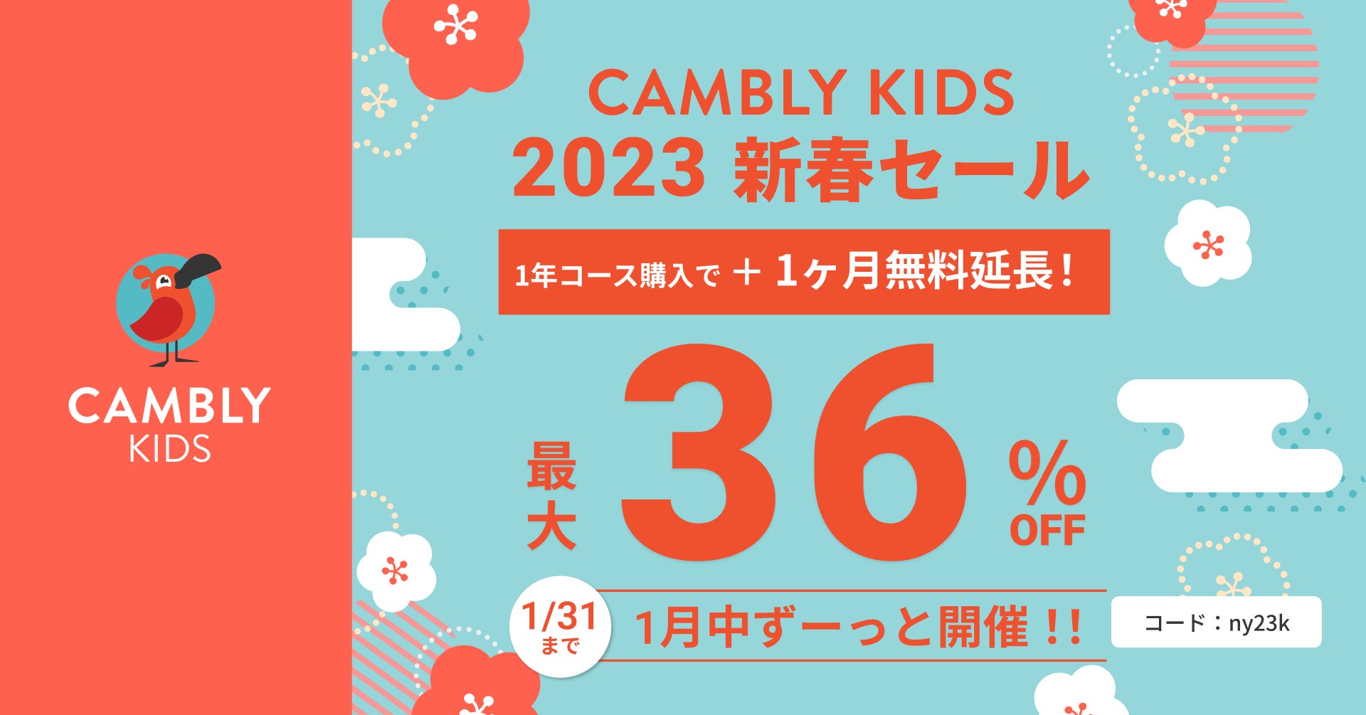 Cambly Inc.(本社:アメリカ・サンフランシスコ、日本代表:佐藤 亜希子)が提供する子ども向けオンライン英会話サービス「Cambly Kids(キャンブリー キッズ)」は、1月5日(木)からスタートした新春セールを1月31日(火)まで延長開催いたします。セール期間中は英会話レッスンが最大36%オフ、さらに対象者にはレッスンプラン1ヶ月無料延長の特典がついてきます。
