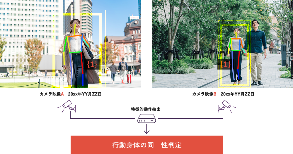 MCT(マルチカメラトラッキング)は商業施設や公共機関、街中などに設置した複数の異なるカメラ間で同一人物を追跡し、服装や髪形、昼夜間を問わずカメラ映像に映った「特徴的動作」に基き、シーンに応じて人に個体識別IDの付与をして同一性を特定します。