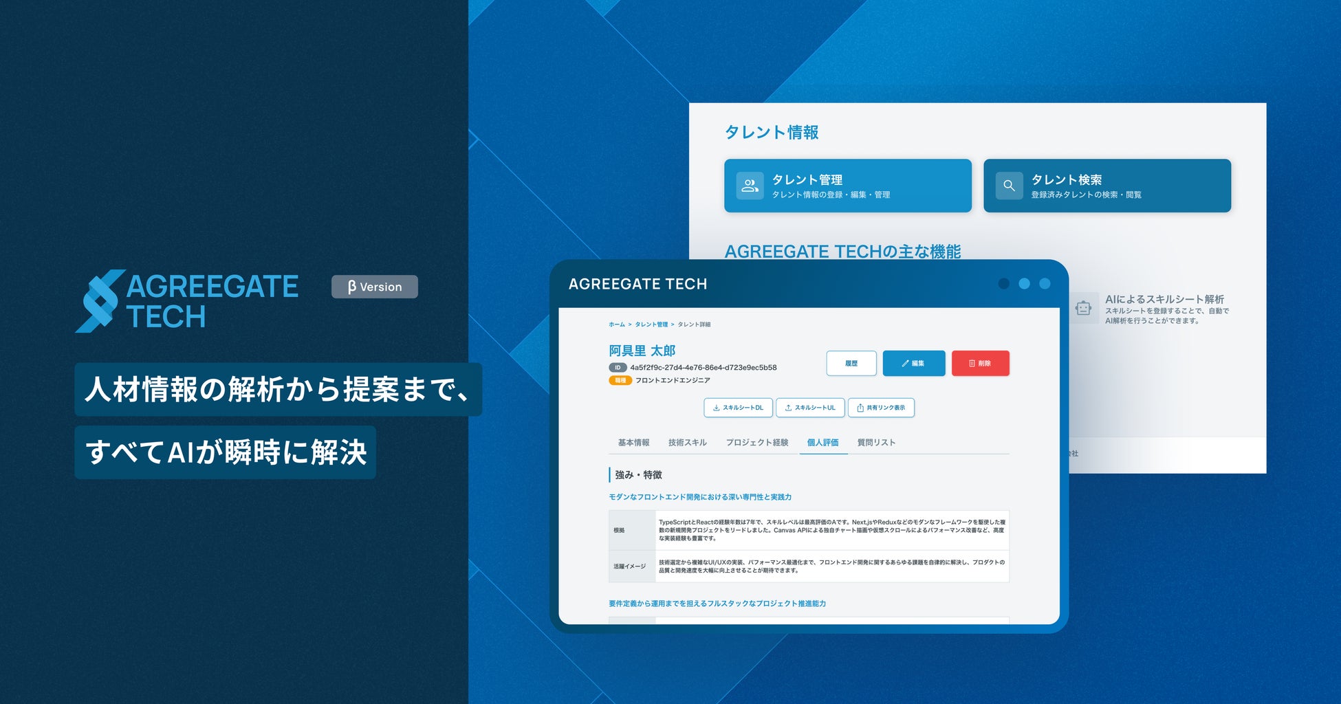 「AGREEGATE TECH」は、企業のミッション実現を軸に、伴走型の支援を提供するパートナープログラム型の事業支援サービスです。リソース提供にとどまらない、戦略的な提案と実行力で、企業のBtoCサービスの立ち上げやDX推進を支援します。この事業支援において、より迅速かつ質の高いご提案を実現するため、AIが人材情報の解析を行うAI SaaSを開発しました。なお、今後はAIが人材情報解析から人材と案件のマッチング(現在開発中)までをワンストップで行うサービスへと進化していく予定です。