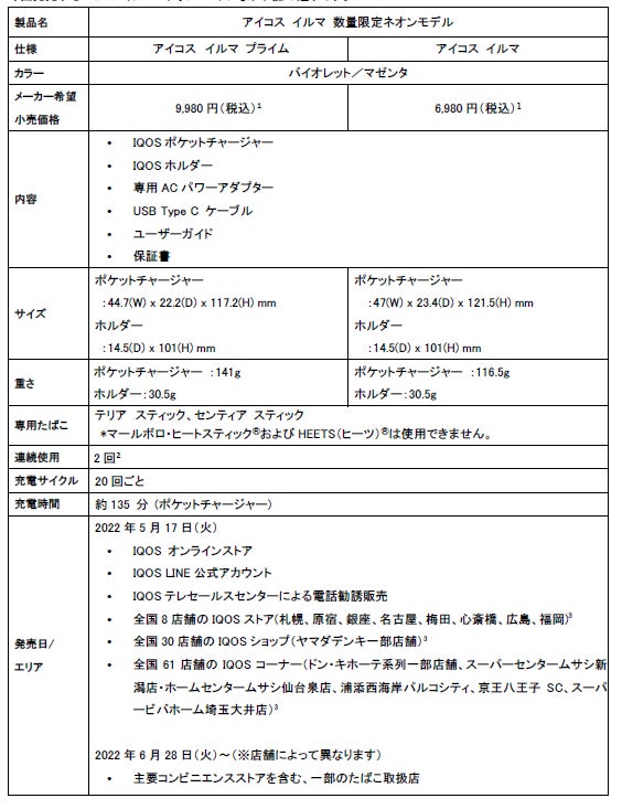 フィリップ モリス ジャパン合同会社(本社:東京都千代田区、社長:シェリー・ゴー、以下「PMJ」又は「当社」)は、ブレードをなくし、使用後のクリーニングが不要になるスマートコア・インダクション・システム®を搭載した加熱式たばこIQOS イルマ シリーズのうち、IQOS イルマ プライムおよびIQOS イルマより、初の限定モデルとなる「IQOS イルマ ネオン モデル」を、5月17日(火)より、IQOS オンラインストア、IQOS LINE公式アカウント、IQOSテレセールスセンターによる電話勧誘、および全国8店舗のIQOSストア、IQOSショップ(ヤマダデンキ一部店舗)、IQOSコーナー(ドン・キホーテ系列一部店舗他)で販売を開始いたします。また6月28日(火)より、主要コンビニエンスストアを含む、一部のたばこ取扱店で、順次発売いたします。