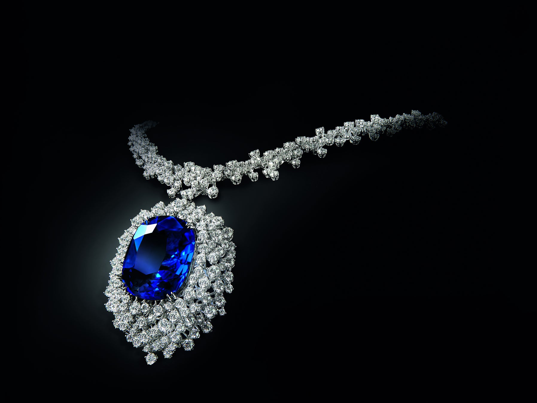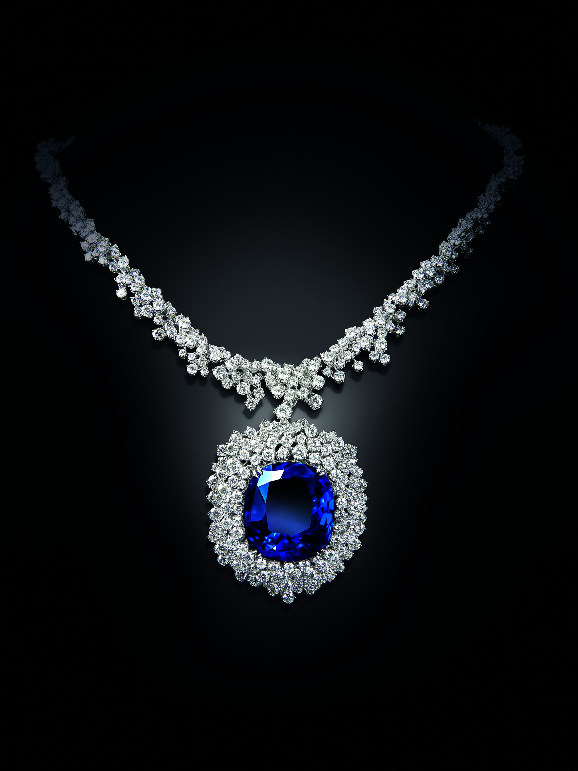 詳細:ホワイトゴールド、クッションカットのサファイヤ1個(100.19カラット、原産地スリランカ)、ダイヤモンド。