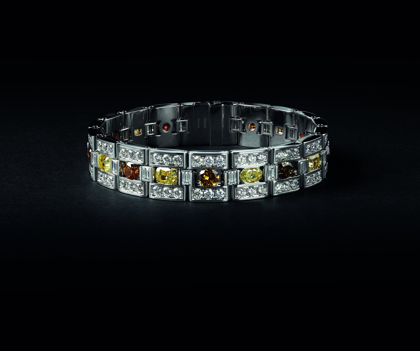 詳細:ホワイトゴールド、ブリリアントカットのファンシーダイヤモンド6個(ディープイエローオレンジ、ディープオレンジイエロー、ディープブラウニッシュオレンジイエロー、ディープブラウニッシュイエローイッシュオレンジ)(合計3.06カラット)、オーバルカットのイエローファンシーダイヤモンド3個(合計1.56カラット)、クッションカットのファンシーダイヤモンド7個(イエロー、ディープブラウンオレンジ、インテンスイエロー、ダークオレンジーブラウン)(合計4.60カラット)、ハートカットのディープブラウンイエローのファンシーダイヤモンド1個(0.74カラット)、ブリリアントカットとバゲットカットのダイヤモンド(合計9.78カラット)。