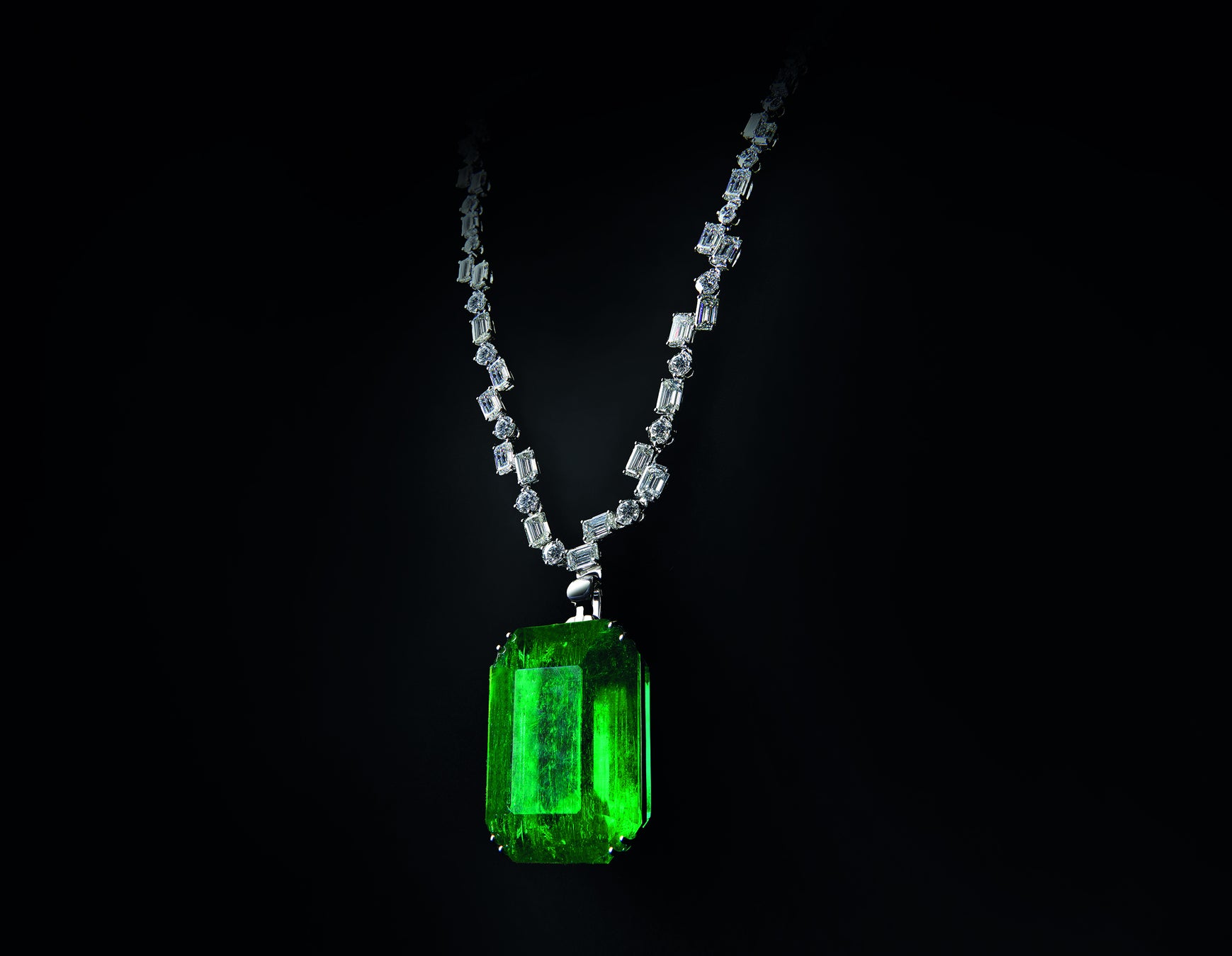 詳細:ホワイトゴールド、エメラルド(ムゾー鉱山産の63.97カラットのエメラルドカットのエメラルド1個、原産地コロンビア)、ダイヤモンド(エメラルドカット、ブリリアントカット)。