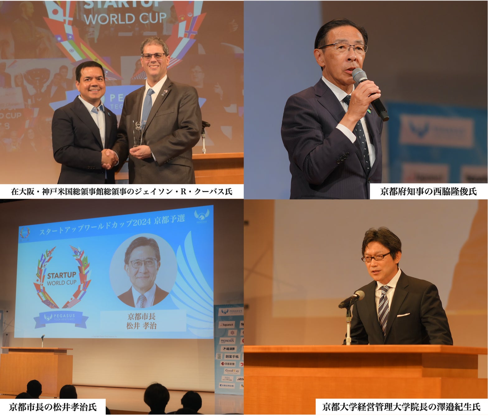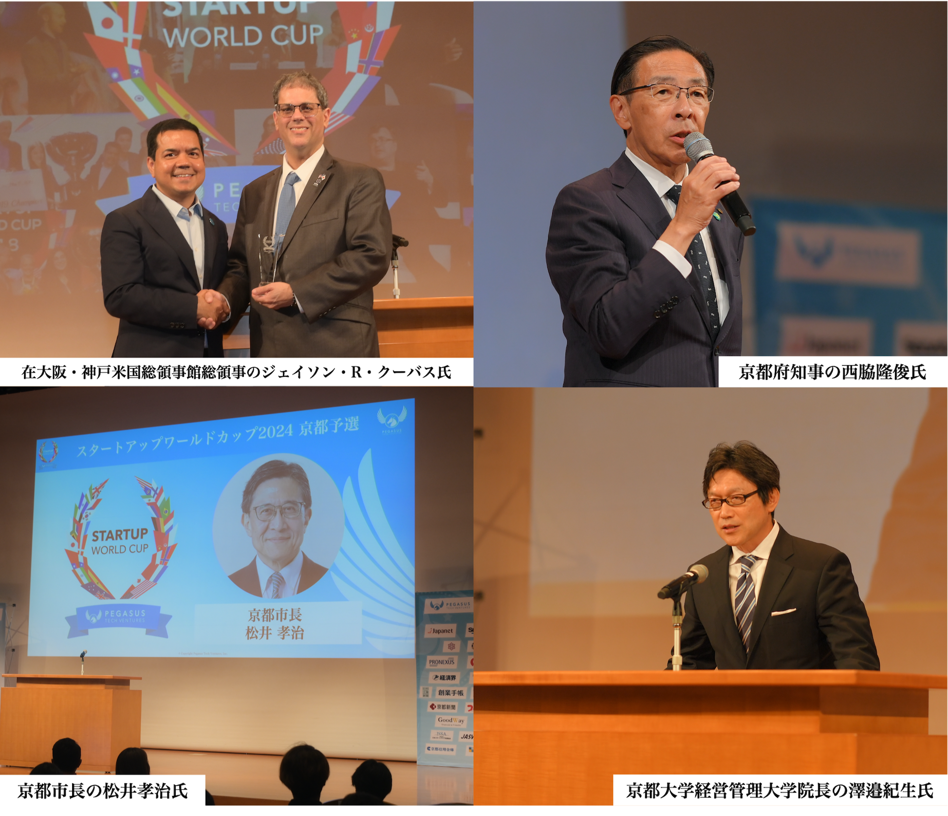 同大会では、在大阪・神戸米国総領事館総領事のジェイソン・R・クーバス氏や京都府知事の西脇隆俊氏、そして京都予選共催の京都大学経営管理大学院長の澤邉 紀生氏が登壇するスタートアップの応援に駆けつけてくださいました。さらに、京都市の松井孝治市長も応援メッセージを届けてくださった他、ピッチ戦の中盤では、サプライズで元プロサッカー選手であり、現在は、自らを「挑戦者」として経営者・投資家・教育者等多方面で活躍する本田圭佑氏もスタートアップのグローバルでの挑戦を後押しするメッセージを届けてくださいました。