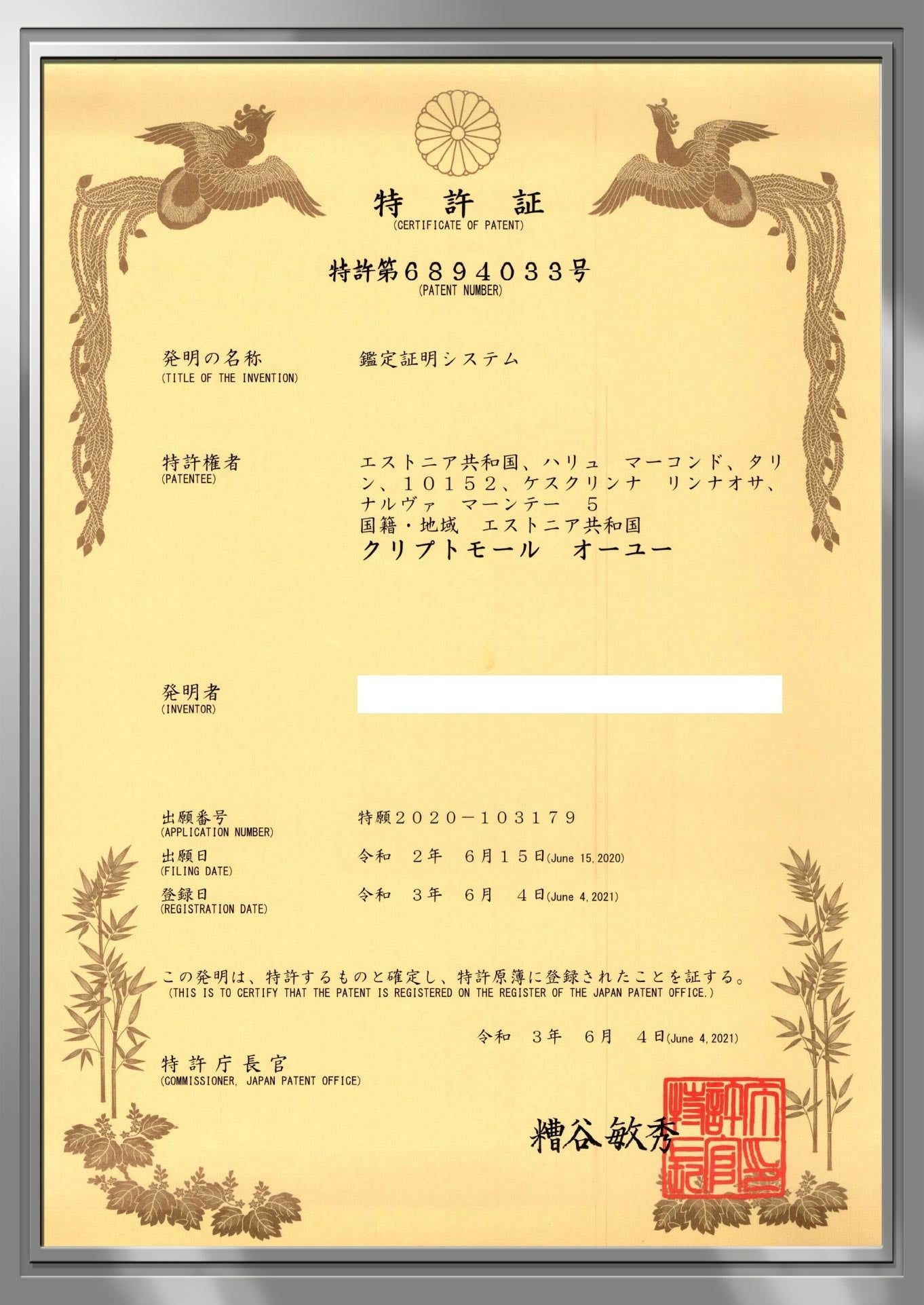 弊社の特許は、JP:第6894033号、EP:3926568、US:2021-0390557 A1。これにより、世界における唯一無二の発明として保護され、弊社オンリーワンサービスとなります。