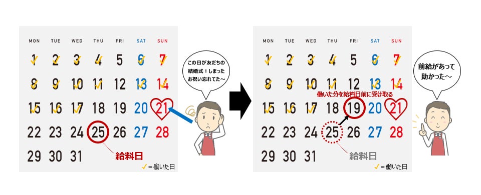 きらぼしテックが提供する「前給」の導入により、勤怠管理や給与管理の社内プロセスはそのままに、従業員は働いた翌日から、働いた分の社内融資の資金受取が可能となります。