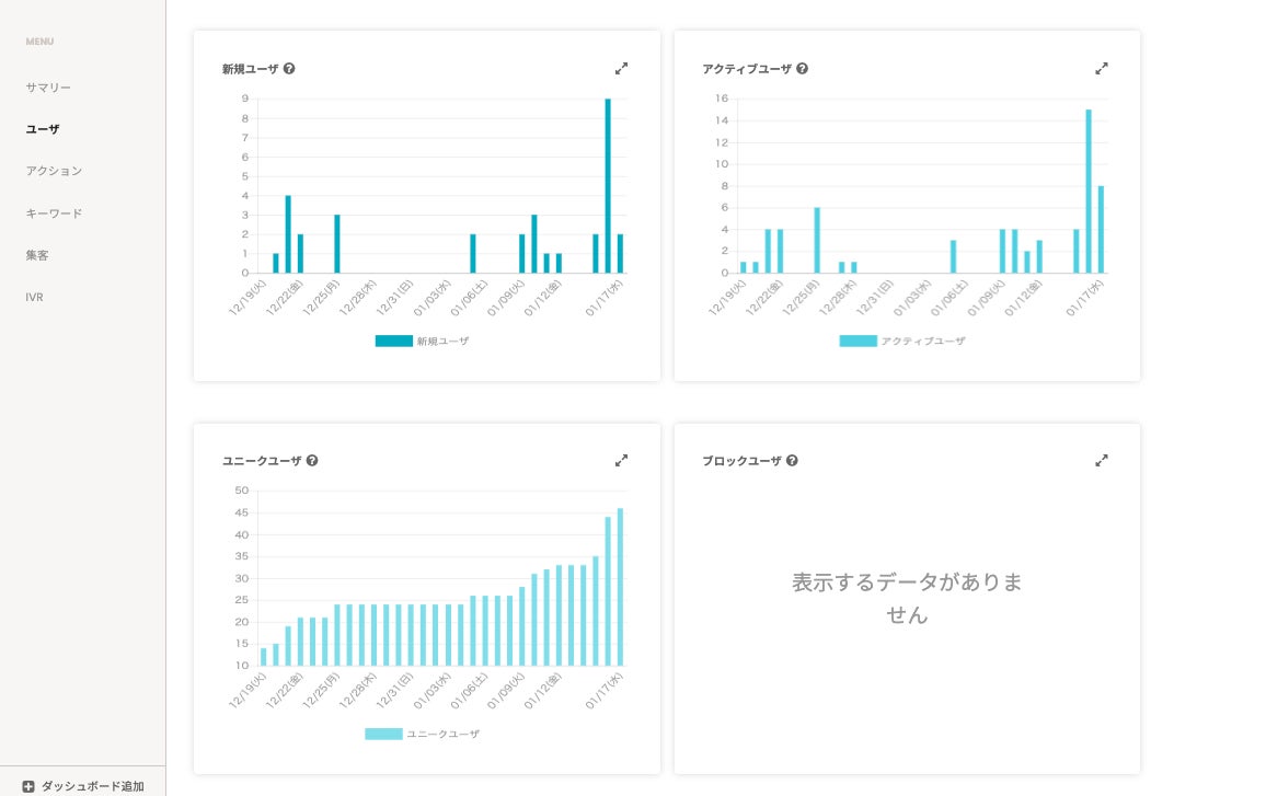 新規ユーザ、アクティブユーザ、ユニークユーザ、ブロックユーザがグラフで表示されます。