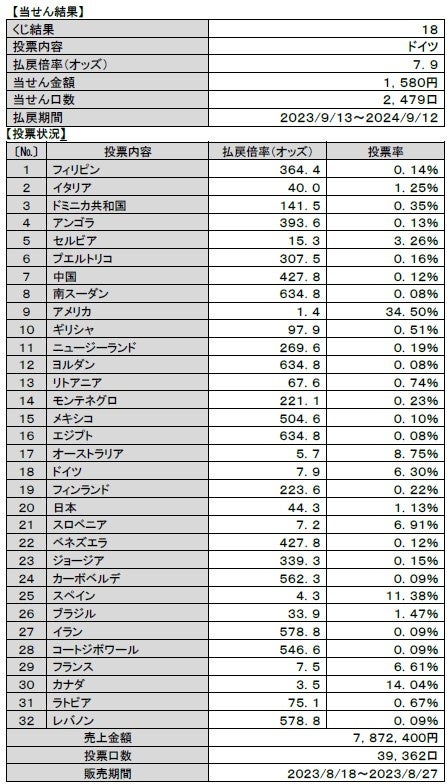 全32選択肢のうち最も多かった投票内容は、「アメリカ」の優勝、払戻倍率(オッズ)は1.4倍となった中、7番目に投票の多かった結果となりました。