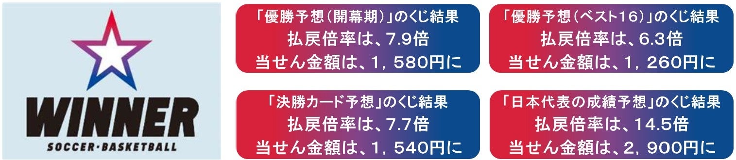・日本代表の成績は「19位」となり、払戻倍率(オッズ)は14.5倍、当せん金額は2,900円となりました。
