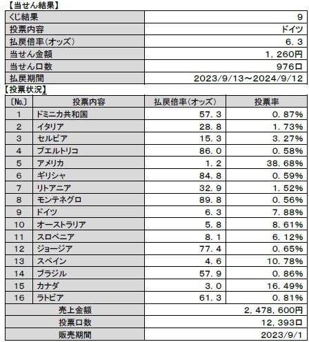 全16選択肢のうち最も多かった投票内容は、「アメリカ」の優勝、払戻倍率(オッズ)は1.2倍となった中、5番目に投票の多かった結果となりました。