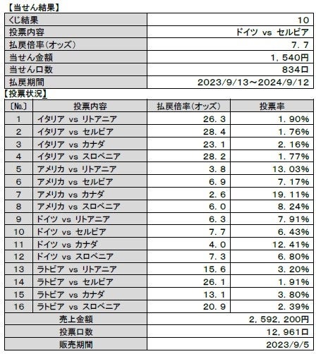 ・決勝の対戦カードは「ドイツ vs セルビア」となり、払戻倍率(オッズ)は7.7倍、当せん金額は1,540円となりました。