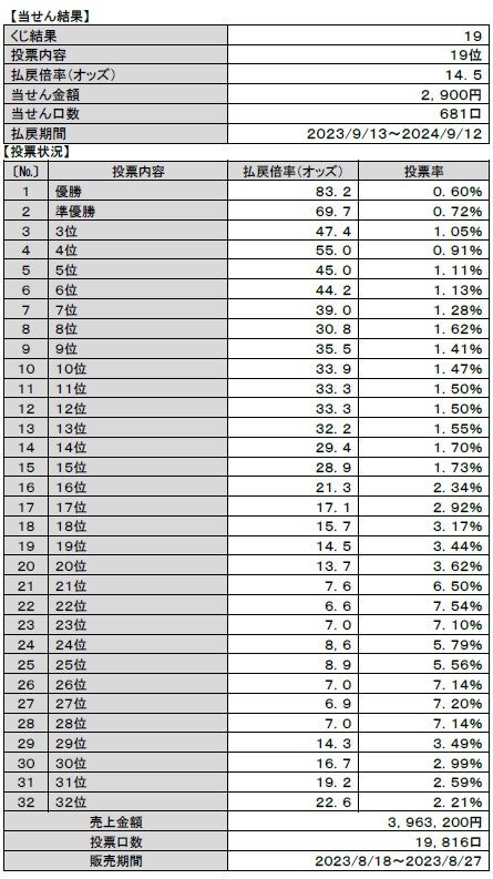 全32選択肢のうち最も多かった投票内容は、「22位」、払戻倍率(オッズ)は6.6倍となった中、11番目に投票の多かった結果となりました。