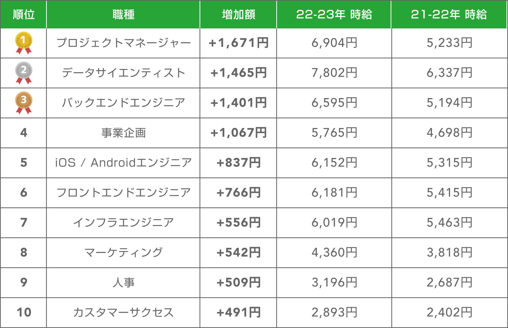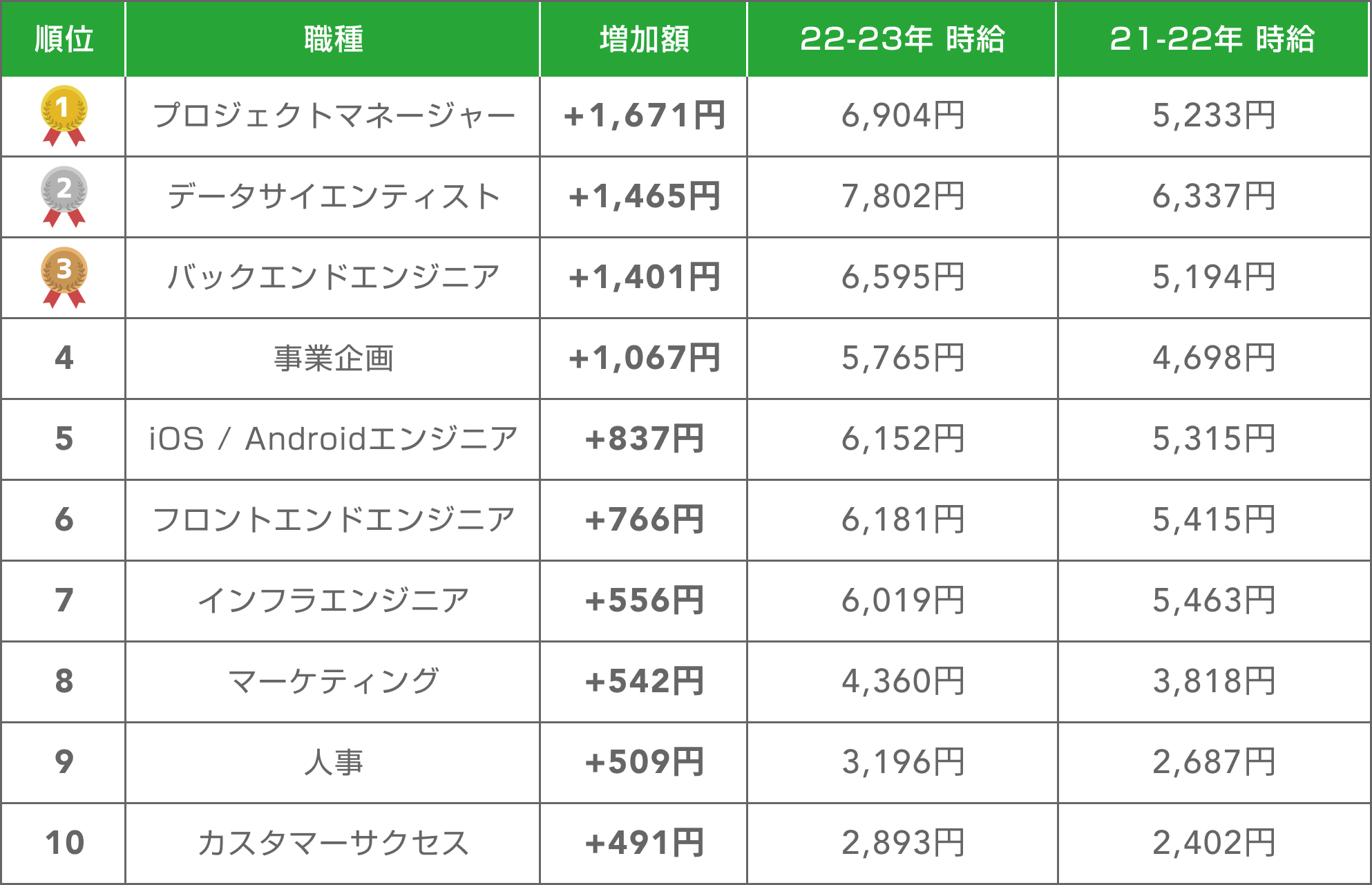 エンジニア(バックエンド、iOS / Android、フロントエンド、インフラ):全てのエンジニアの職種で年収が上昇しており、それぞれの職種での増加率は、バックエンドエンジニアで27%、iOS / Androidエンジニアで16%、フロントエンドエンジニアで14%、インフラエンジニアで10%です。この成長は、技術の進歩とデジタル変革の進行に伴い、これらの職種がますます重要になっていることを示しています。