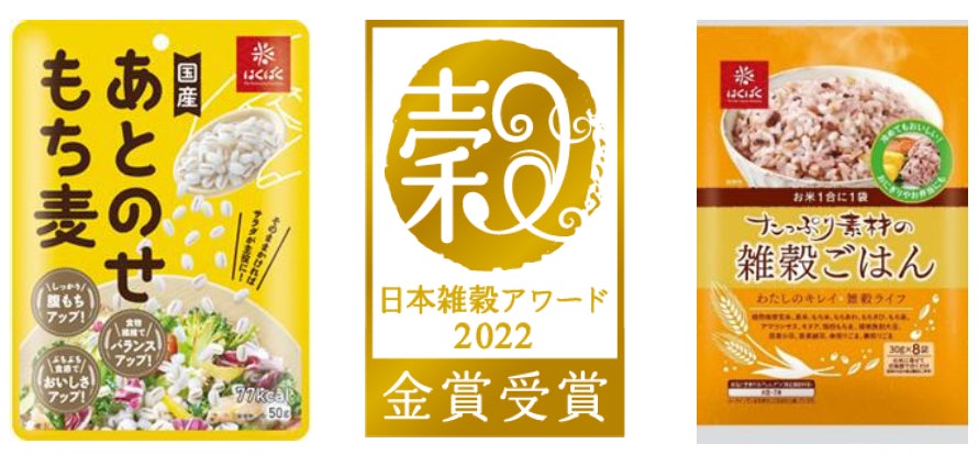 穀物のリーディングカンパニー株式会社はくばく(本社:山梨県中央市、代表取締役社長:長澤 重俊)は、一般社団法人日本雑穀協会が主催する「日本雑穀アワード2022《一般食品部門》」にて、『あとのせもち麦』『たっぷり素材の雑穀ごはん』の2品が“金賞”を受賞いたしました。