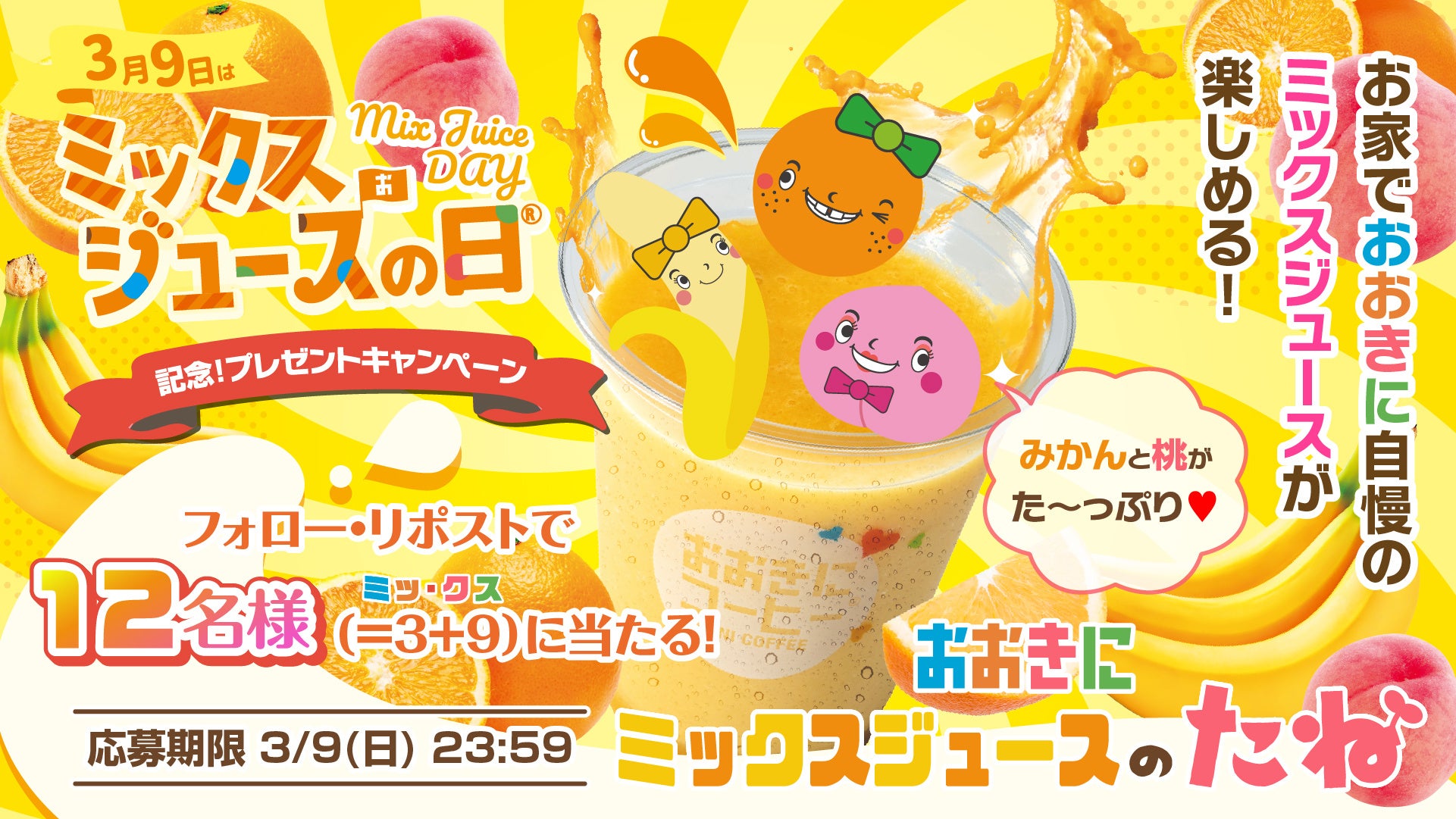 おおきにコーヒー株式会社が「ミックス=39」の語呂合わせから制定した 3月9日「ミックスジュースの日」(日本記念日協会認定)。 この日を記念して、お得なイベントを開催します!