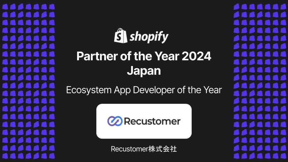 購入後体験プラットフォーム「Recustomer(リカスタマー)」を運営するRecustomer株式会社(本社:東京都中央区、代表取締役:柴田 康弘、辻野 翔大)はグローバルコマースをリードするShopify(ショッピファイ)の日本法人Shopify Japan株式会社(本社:東京都渋谷区、暫定カントリーマネージャー:ショーン・ブロートン))が発表した2024年度最も活躍したパートナーを表彰するアワード「Shopify Partner of the Year 2024 - Japan」において、「Ecosystem App Developer of the Year」を受賞いたしました。