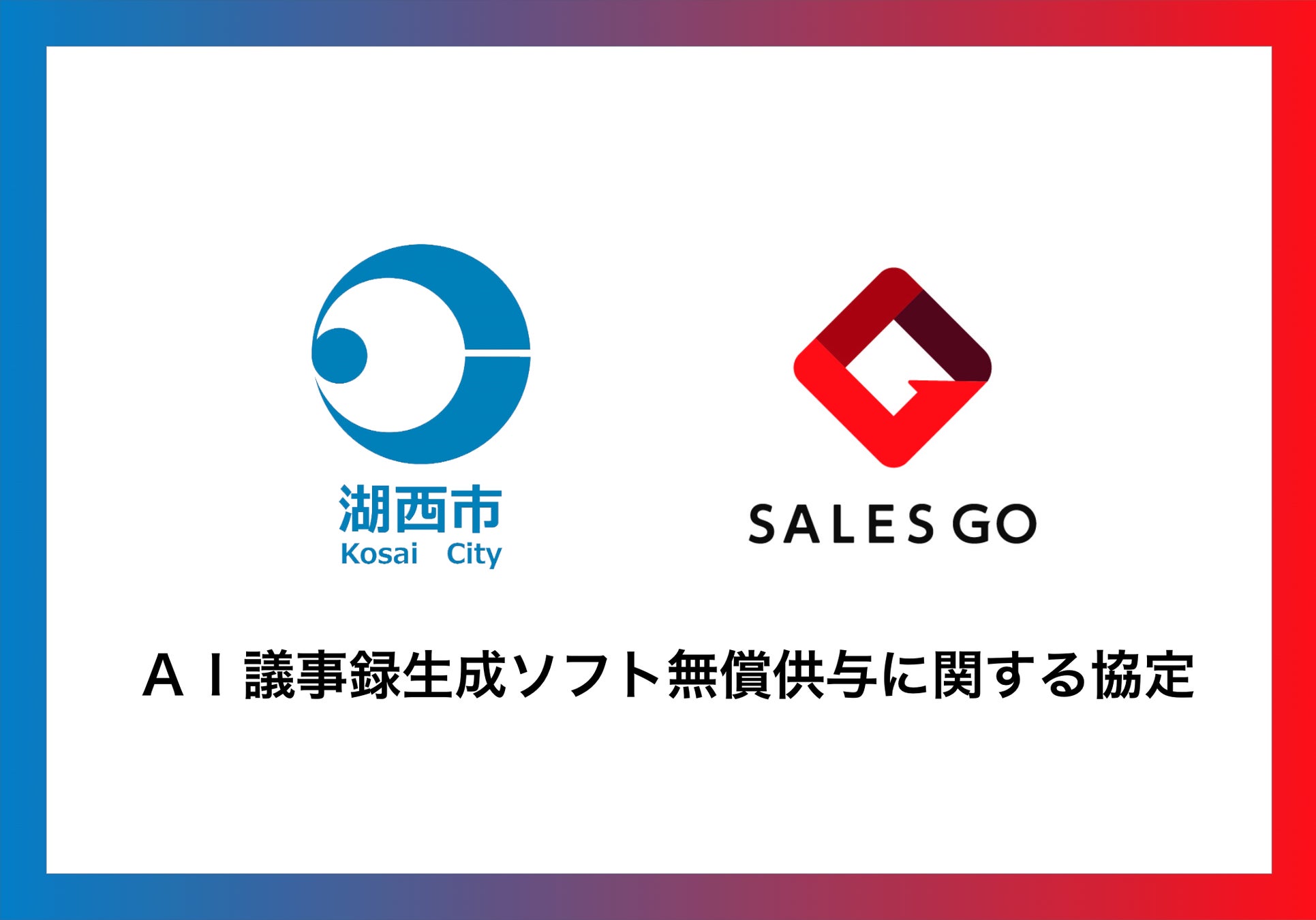 代表・内山の出身地である湖西市に対し、SALES GO が開発・提供するAI議事録生成ソフト「GoCoo! Meeting」を2年間、初期費用および利用料を無償で提供し、議事録作成の迅速化・精度向上など、行政の業務効率化およびDX推進を支援することを目的としています。