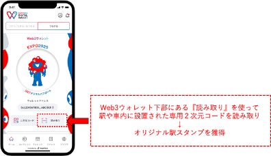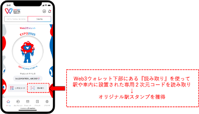 ②アプリのWeb3ウォレットにある「読み取り」機能を使って、スタンプ設置箇所にある専用2次元コードを読み取ることで、オリジナルNFT駅スタンプを獲得