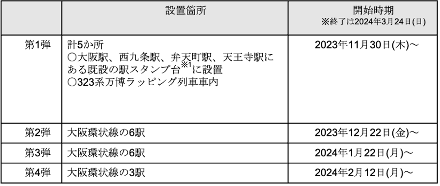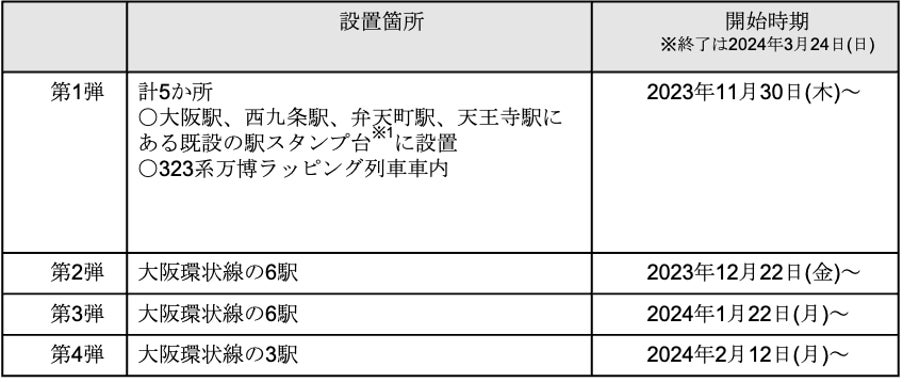 NFT駅スタンプの設置箇所は、スタンプラリーを開始する第1弾では計5カ所に設置し、第4弾まで順次拡大します。大阪環状線全19駅及び323系万博ラッピング列車内の合計20か所に設置する予定です。