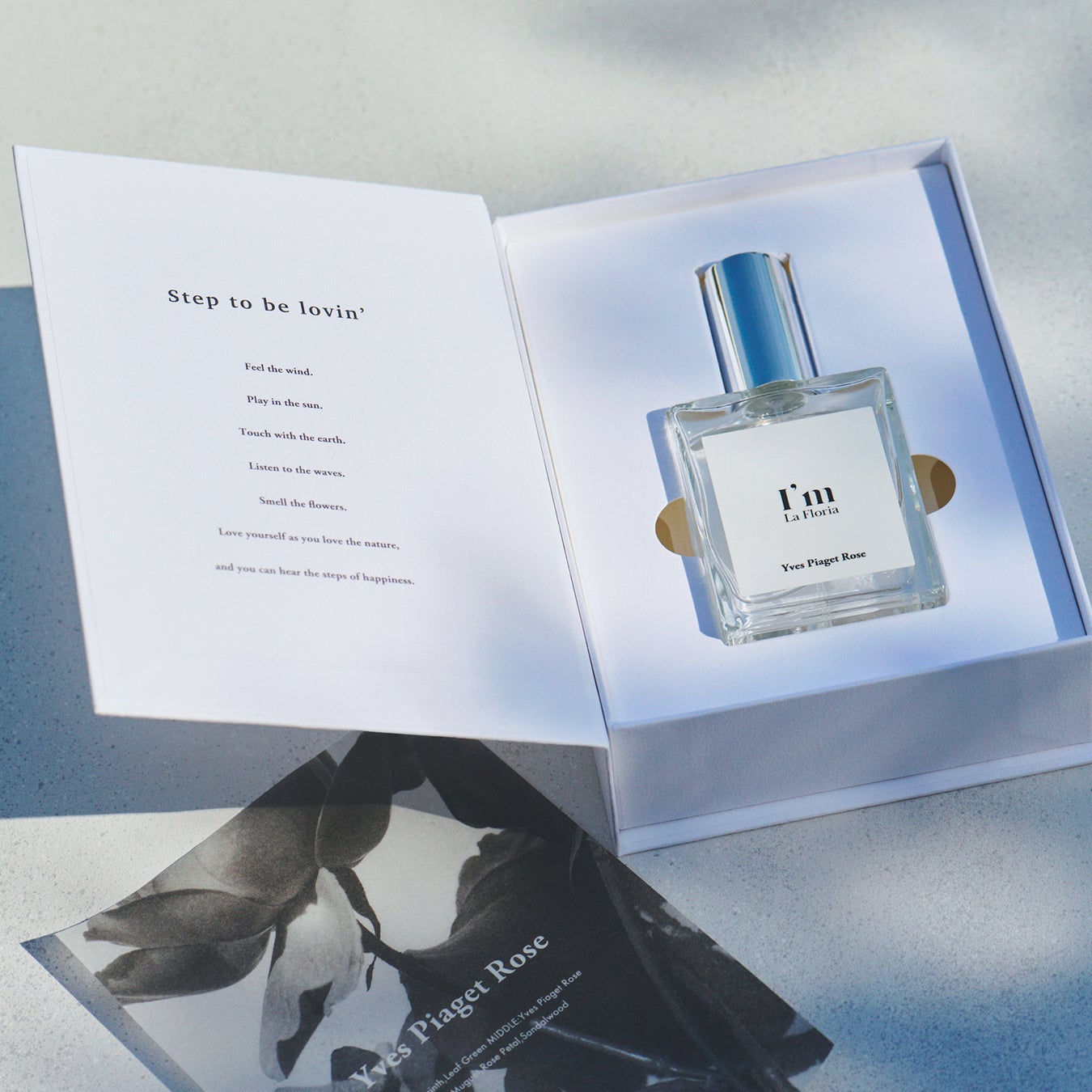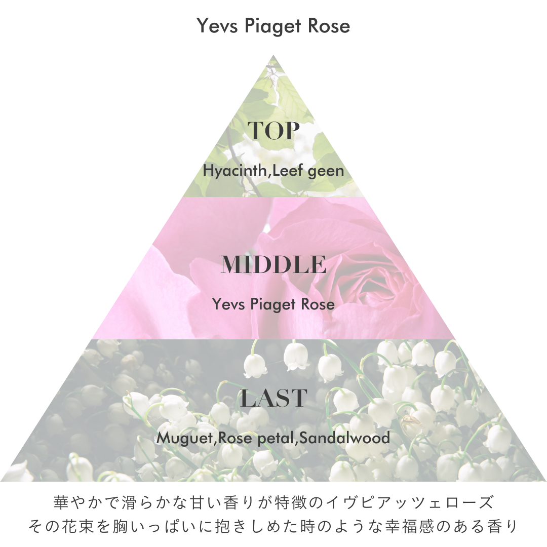そんなイヴピアッツェローズの香りを中心に、TOPにはナチュラルで心地よい香りが広がるヒヤシンスグリーン・リーフィーノートを、そしてLASTにはイヴピアッツェのエレガントな香りを活かしながら心地よい余韻が続くよう、ミュゲ・ローズペダル・サンダルウッドを加えています。