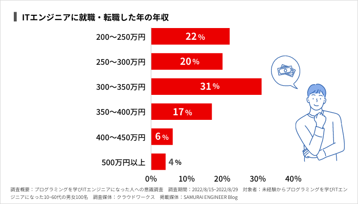 [6]未経験からITエンジニアに就職・転職した年の年収は「300万円〜350万円」が最多