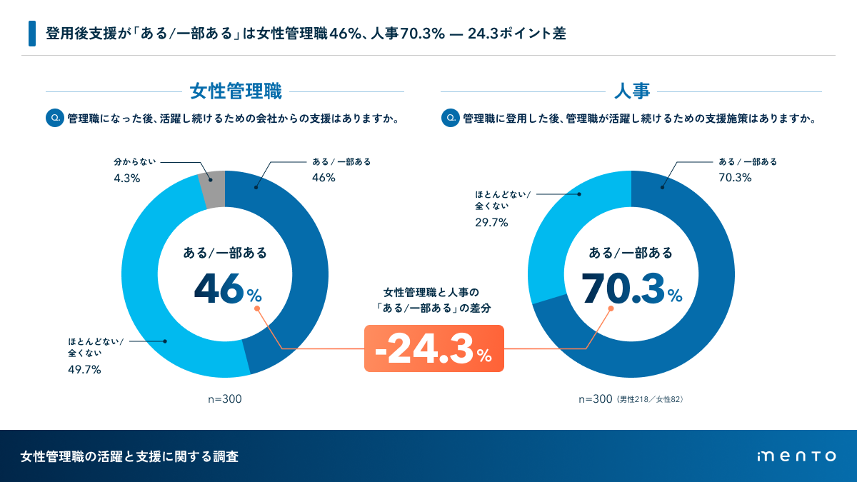 1. 管理職への登用後支援、「ある/一部ある」は女性管理職46%、人事70.3% ― 24.3ポイント差