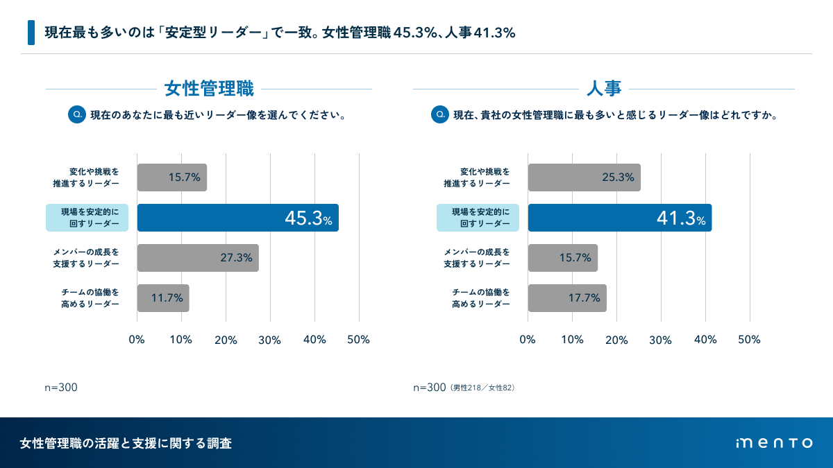 一方、人事では増やしていきたいリーダー像は「変化や挑戦を推進するリーダー」(40.3%)が最多となり、女性管理職の同項目(19%)と比べ、理想像に明確な差が見られました。