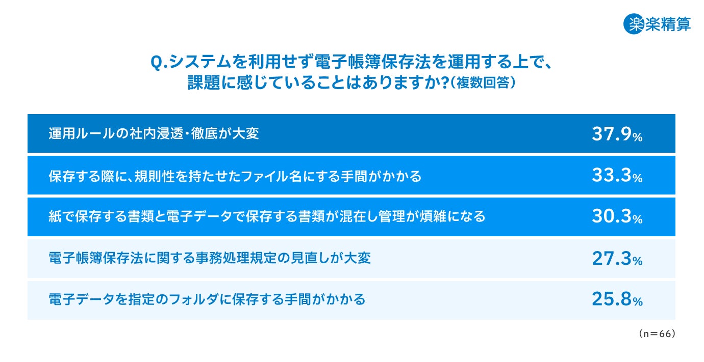 電子帳簿保存法にシステムを利用せずに対応している企業の業務課題として「運用ルールの社内浸透・徹底が大変」「保存する際に、規則性を持たせたファイル名にする手間がかかる」が挙げられた