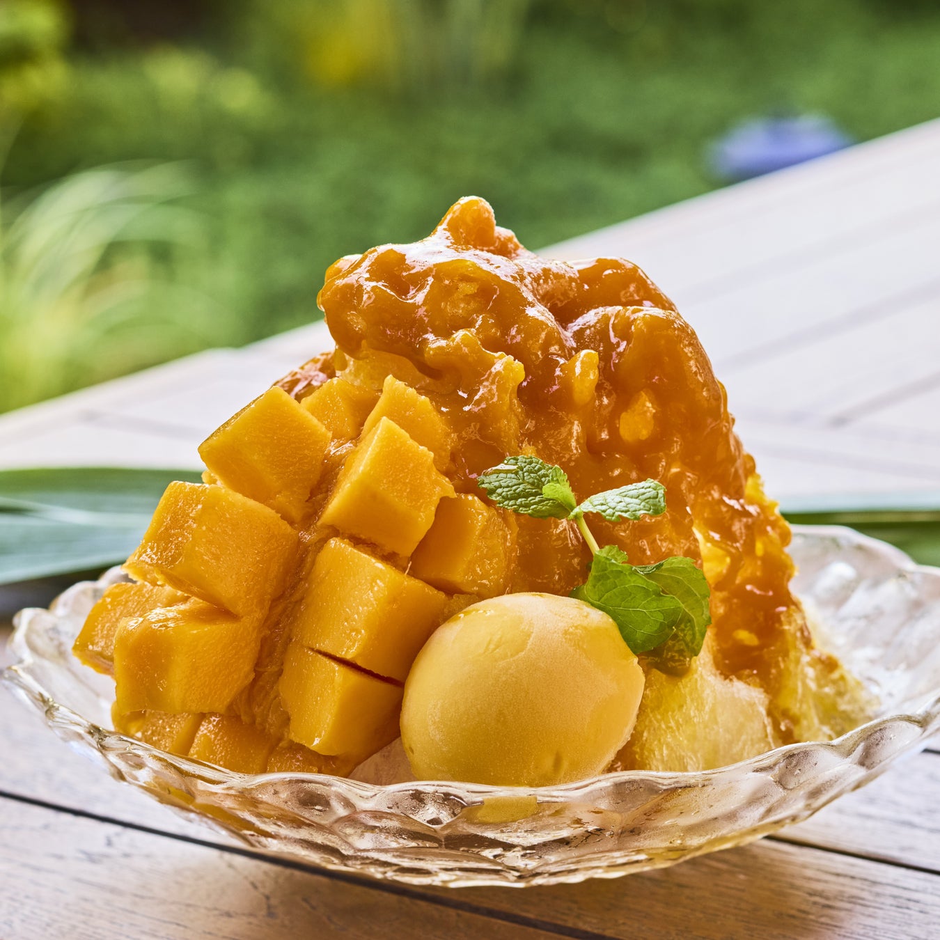 とろけるような甘みの国産のフレッシュマンゴーとマンゴーソルベを添えて。マンゴーソースに爽やかな自家製ジンジャー&ハニーレモンのシロップを合わせた、マンゴーづくしのかき氷。