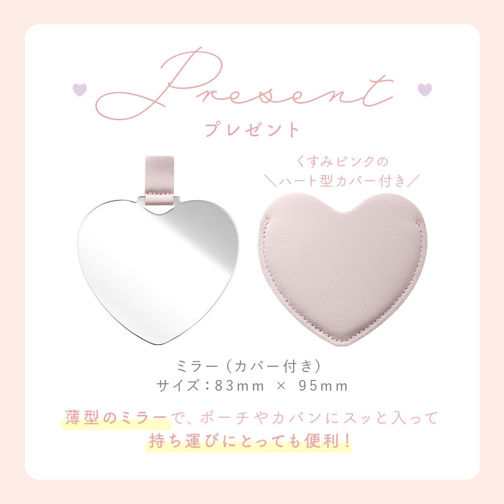 オリジナルハート型ミラーは、くすみピンクのカバー付きで、持ち運ぶ際に鏡が傷つく心配もありません♪バッグやポーチにINしやすい薄型のコンパクトミラーで持ち運びにも便利!