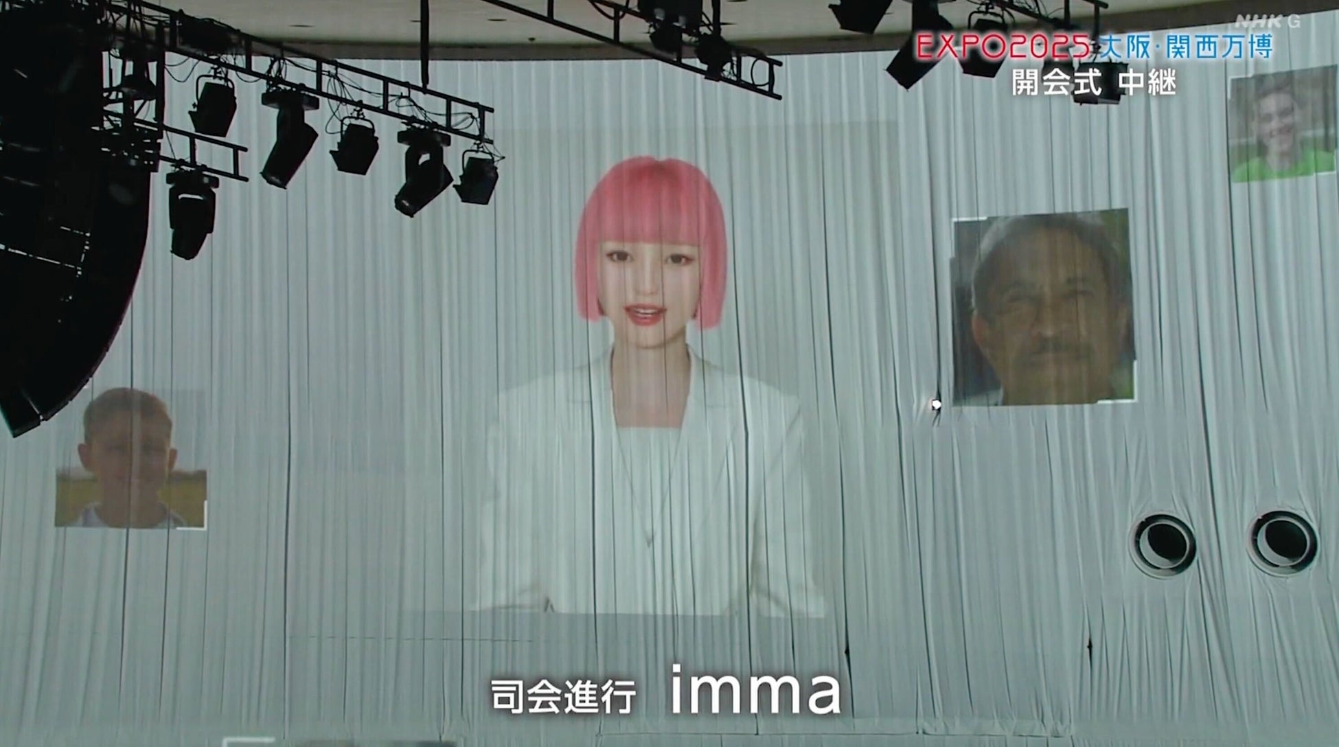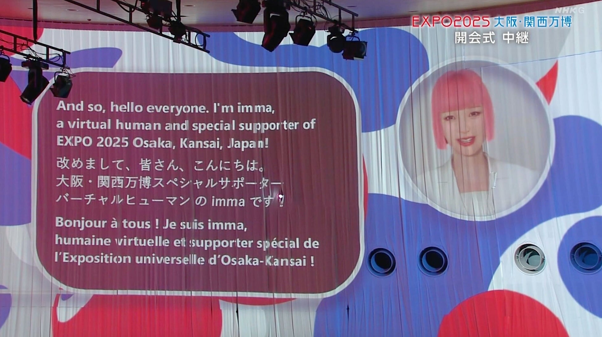 世界中から注目を集める開会の場で、immaは来賓紹介や式典進行などを担い、リアルとバーチャルの垣根を越えた演出で、未来社会への第一歩を彩りました。