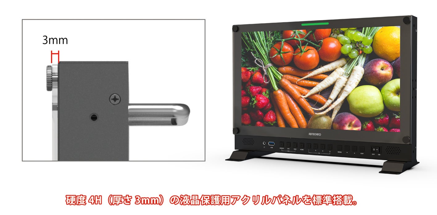 持ち運びに適した15.6型[型番:UH1561S]には硬度4H(厚さ3mm)の液晶保護用アクリルパネルを標準で付属。移動中や現場での不意な液晶パネル破損を防ぎます。※7)