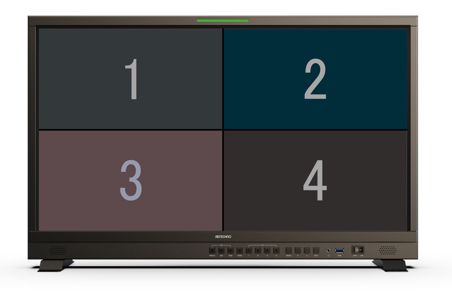 1つの画面上に4つの異なる映像を4分割表示させるマルチビューモードを搭載。SDI 4系統とHDMI 1系統から任意の入力端子を選択し、4分割画面に割り当て表示が可能です。※3)