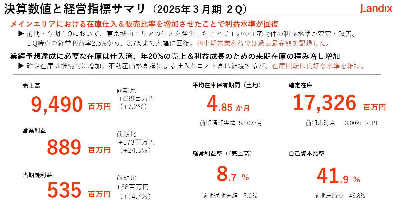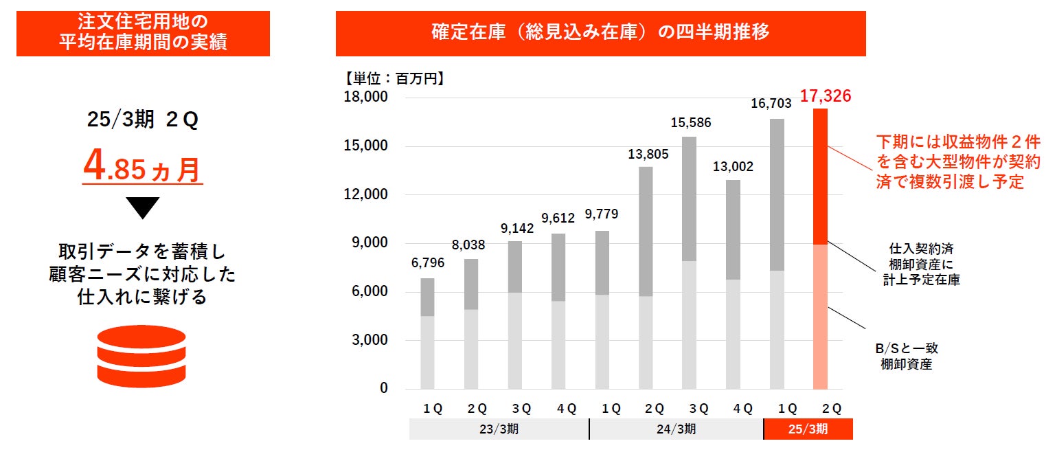 24/3期は原価のコストアップにより利益額前期比を割り込む結果となりました。25/3期においては、下半期に大型の収益物件の引き渡しを予定(既に期中で契約済)しており、今期の業績予想達成に必要な在庫は仕入済の状況となっています。