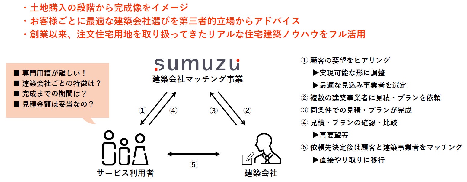 「土地は不動産屋」「建物は建築メーカー」という従来の縦割りの不動産検討フローではなく、sumuzuマッチングにおいては、土地取得の段階から完成系を見据えた総合的なアドバイスを行っていきます。
