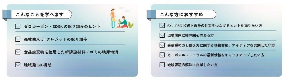 東京・大手町にて注目すべき経済的・社会的効果を先進企業の取り組み等、SXを成功に導くヒントや最新の情報をお届けします。ゼロカーボン、脱炭素、環境問題、森林利活用に興味がある方の参加を募集します。