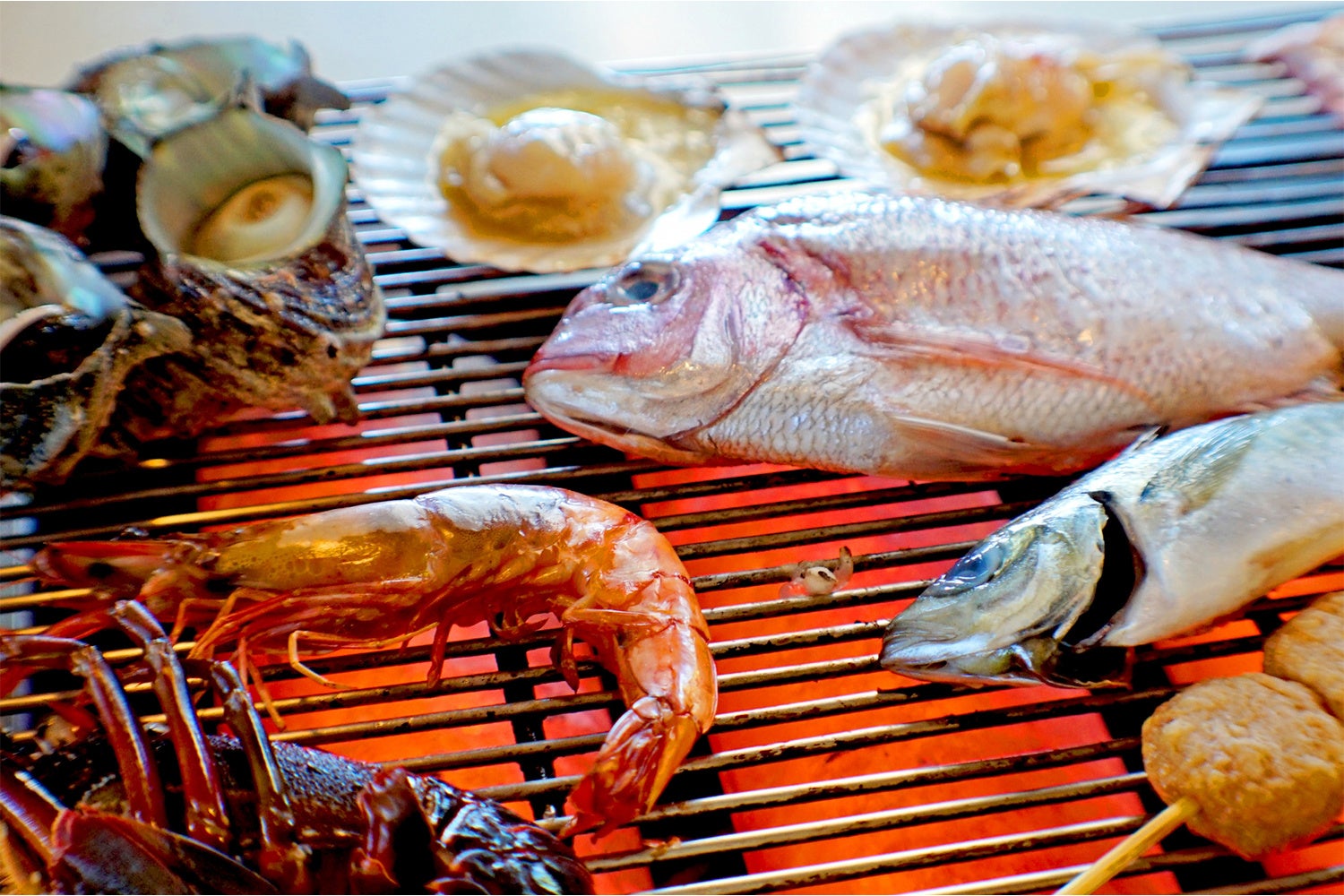 グランピング気分を盛り上げるグランピングBBQは、千葉県産を中心に"Surf and Turf"をコンセプトとした、房総自慢の海の幸、厳選した肉類、新鮮な野菜・果物を、BBQグリルでセルフクッキング。お好きな調理方法で地産地消の新鮮食材をご堪能ください。