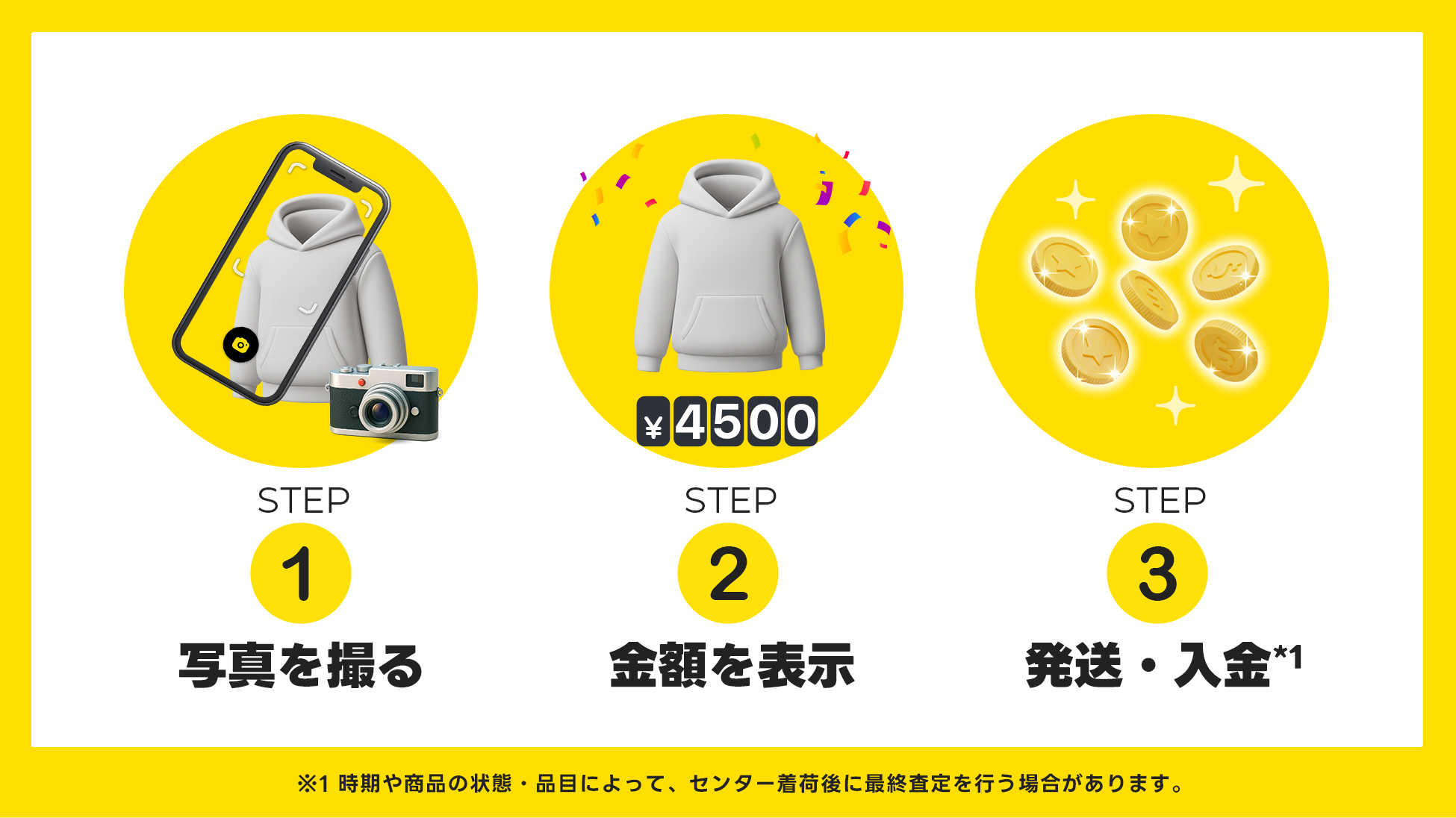 ・商品を撮影するだけで、AIが自動査定し瞬時に金額を提示。発送後すぐに現金化が可能(※1)