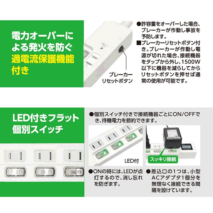各コンセントに個別スイッチが搭載されており、消費電力をチェックしながらこまめにON/OFFの切替が可能。節電意識の高まるアイテムです。