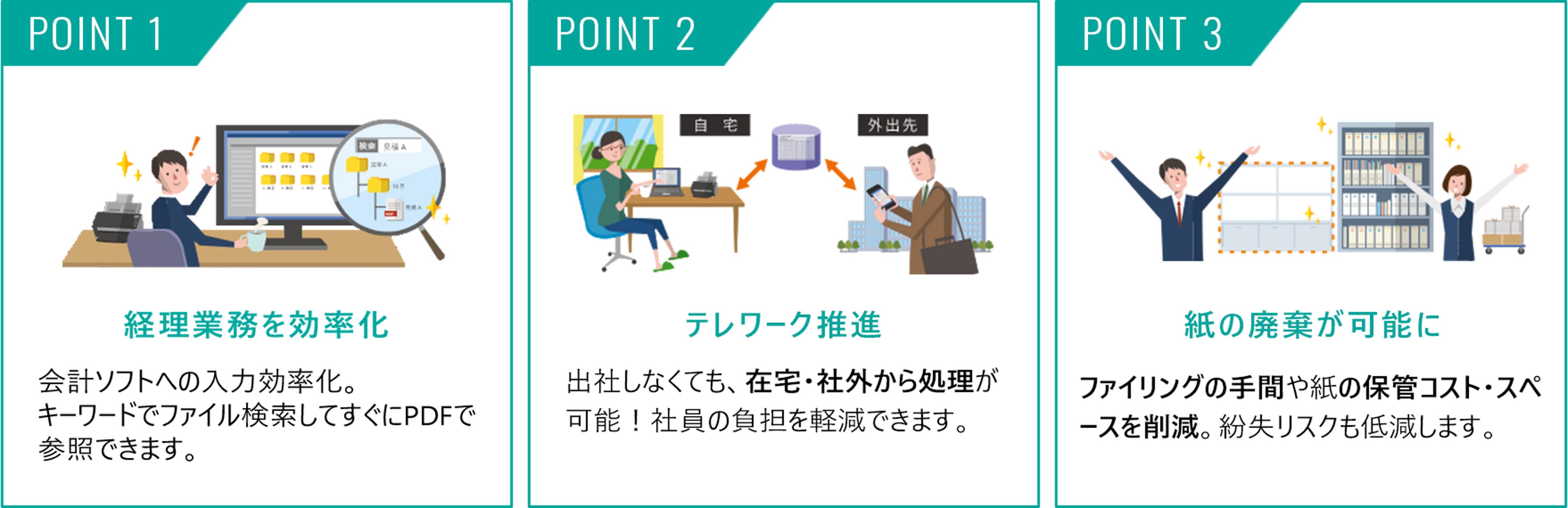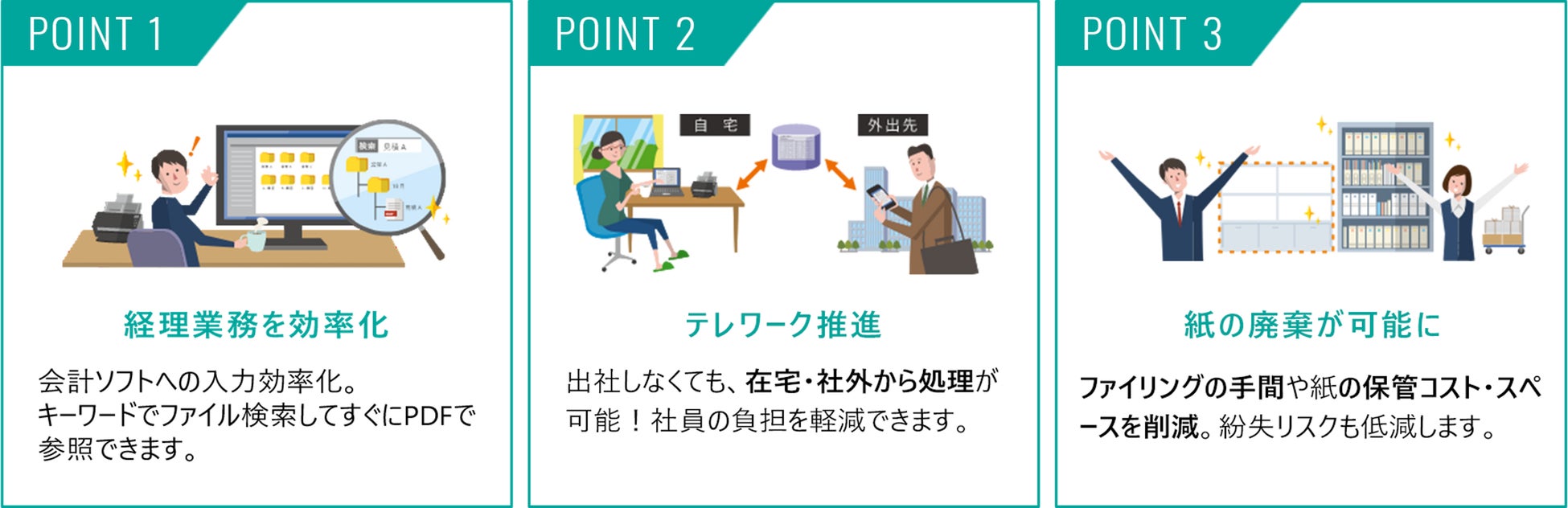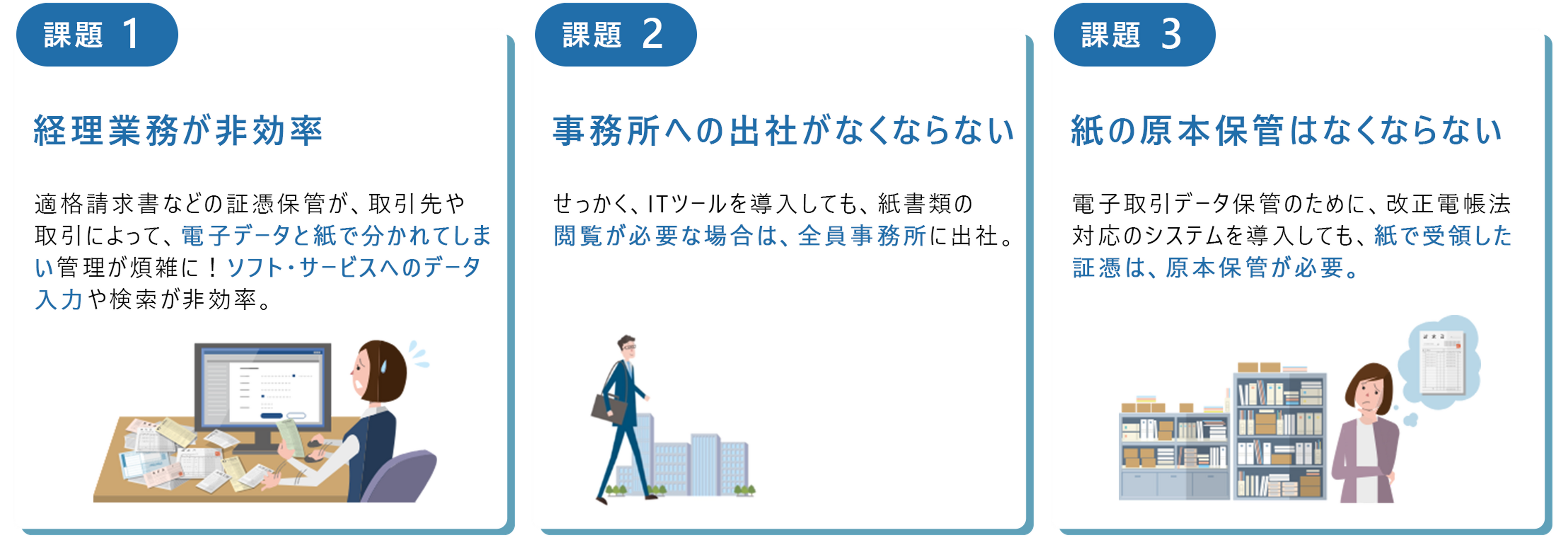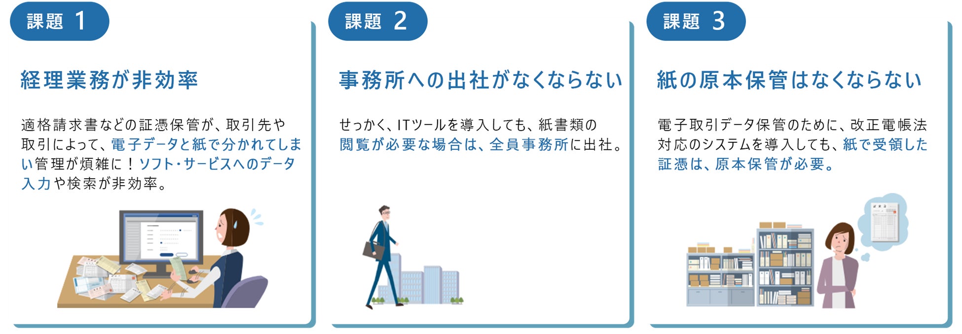 本年は、10月1日に「インボイス制度」施行、12月31日に「電帳法電子取引データ」の印刷保存の宥恕措置終了を控えており、これらの制度に対応したソフト・サービスの導入が加速しています。これに併せ、「電帳法スキャナ保存制度」も導入することで、会計業務のさらなる効率化が可能となります。