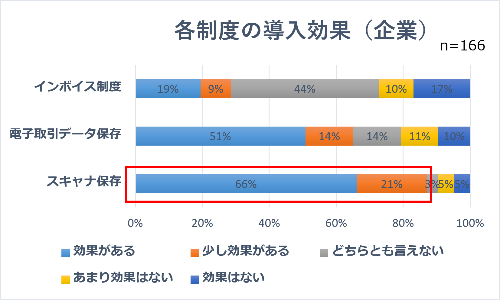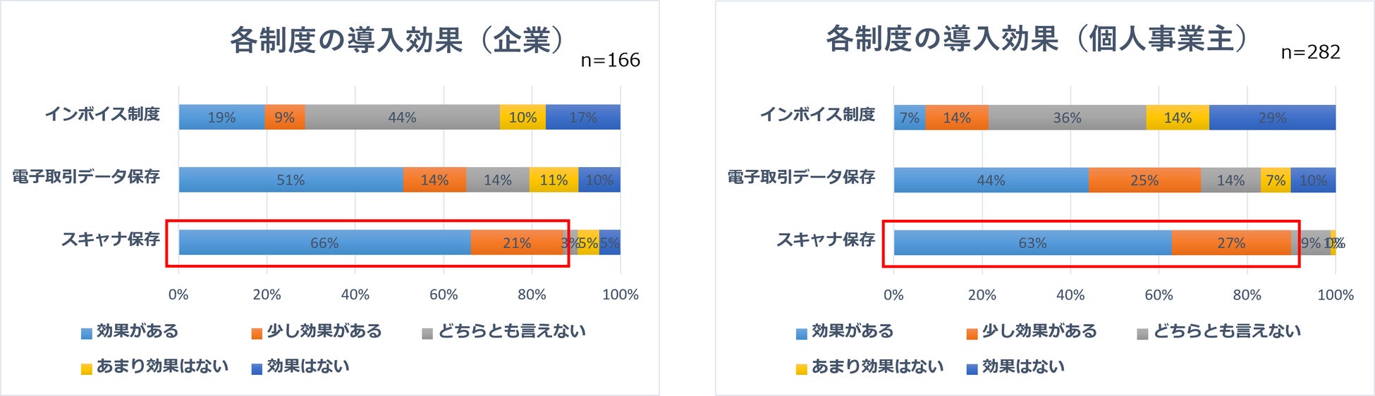 電帳法スキャナ保存を導入の企業、個人事業主共に、9割近くが業務効率化に効果ありと回答している。