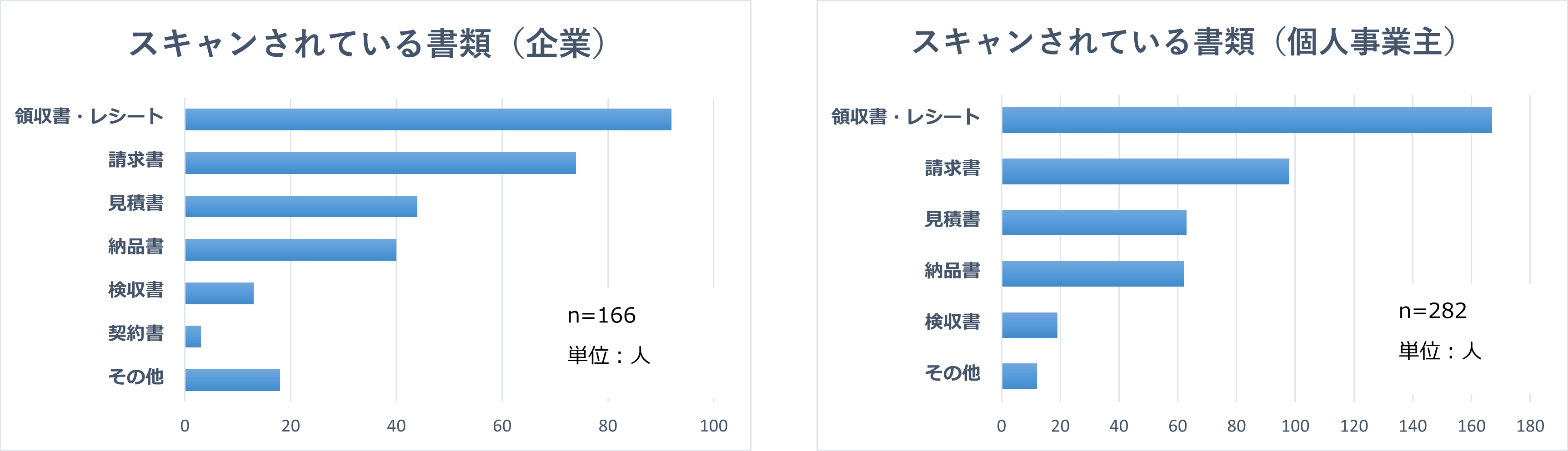 ・会計業務でスキャンされている書類は、企業・個人事業主共に、領収書、レシートが最も多く、請求書、