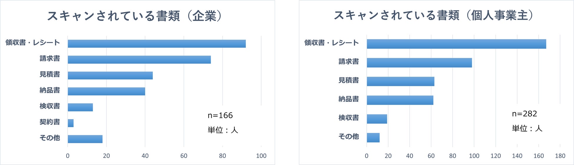 会計業務でスキャンされている書類は、企業・個人事業主共に、領収書・レシートが最も多く、請求書、見積書、納品書、検収書と続く。紙で受領する領収書・レシート、請求書の電子化ニーズが高い。