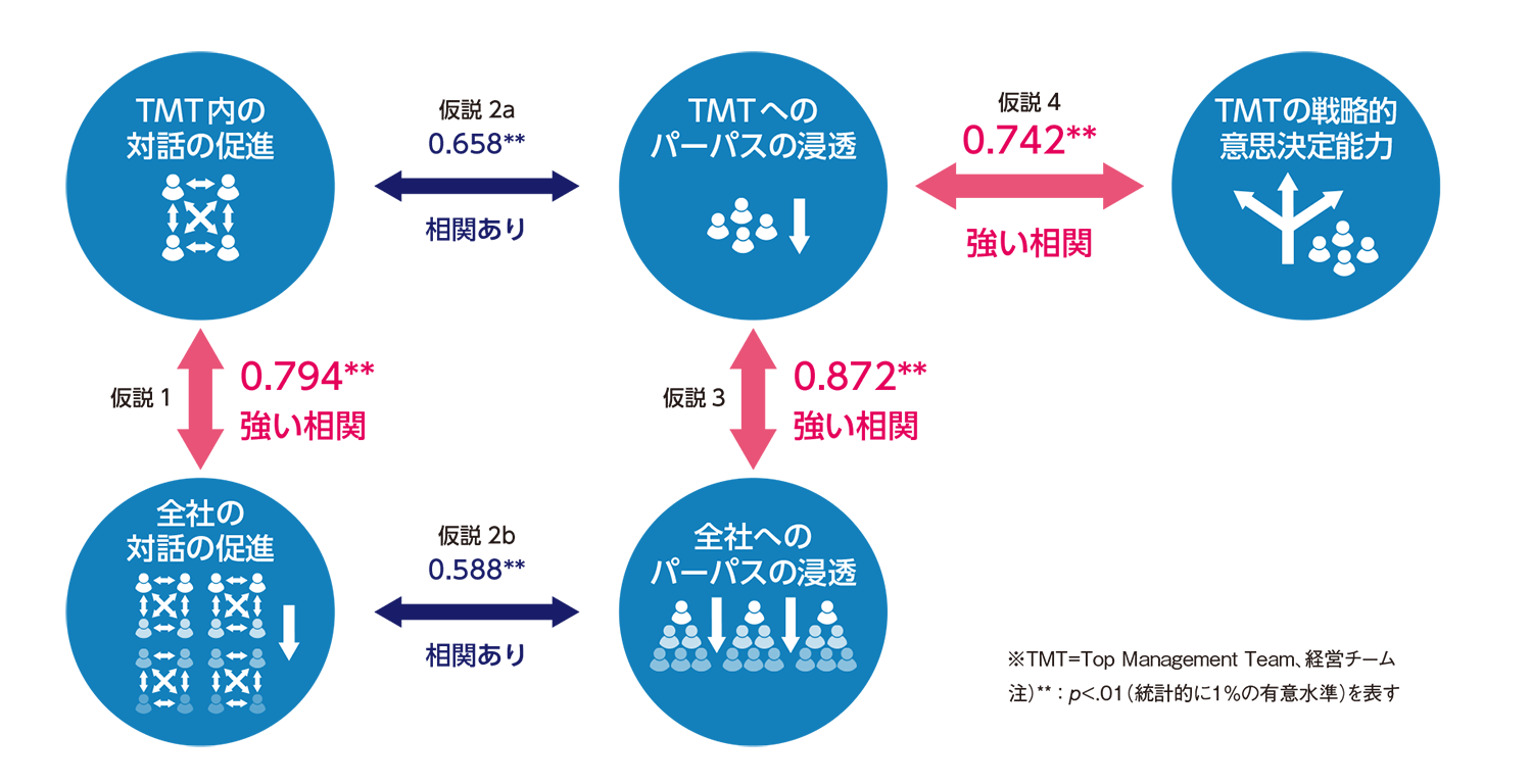 今回は、経営チーム(Top Management Team、以下「TMT」)と会社全体(以下「全社」)の2つに対象を分け、「対話の促進」「パーパスの浸透」「TMTの戦略的意思決定能力」についてアンケート調査を実施しました。その結果、これら3点には正の相関があることがわかり、対話の促進が企業経営においてプラスの効果をもたらすことが示唆されました。