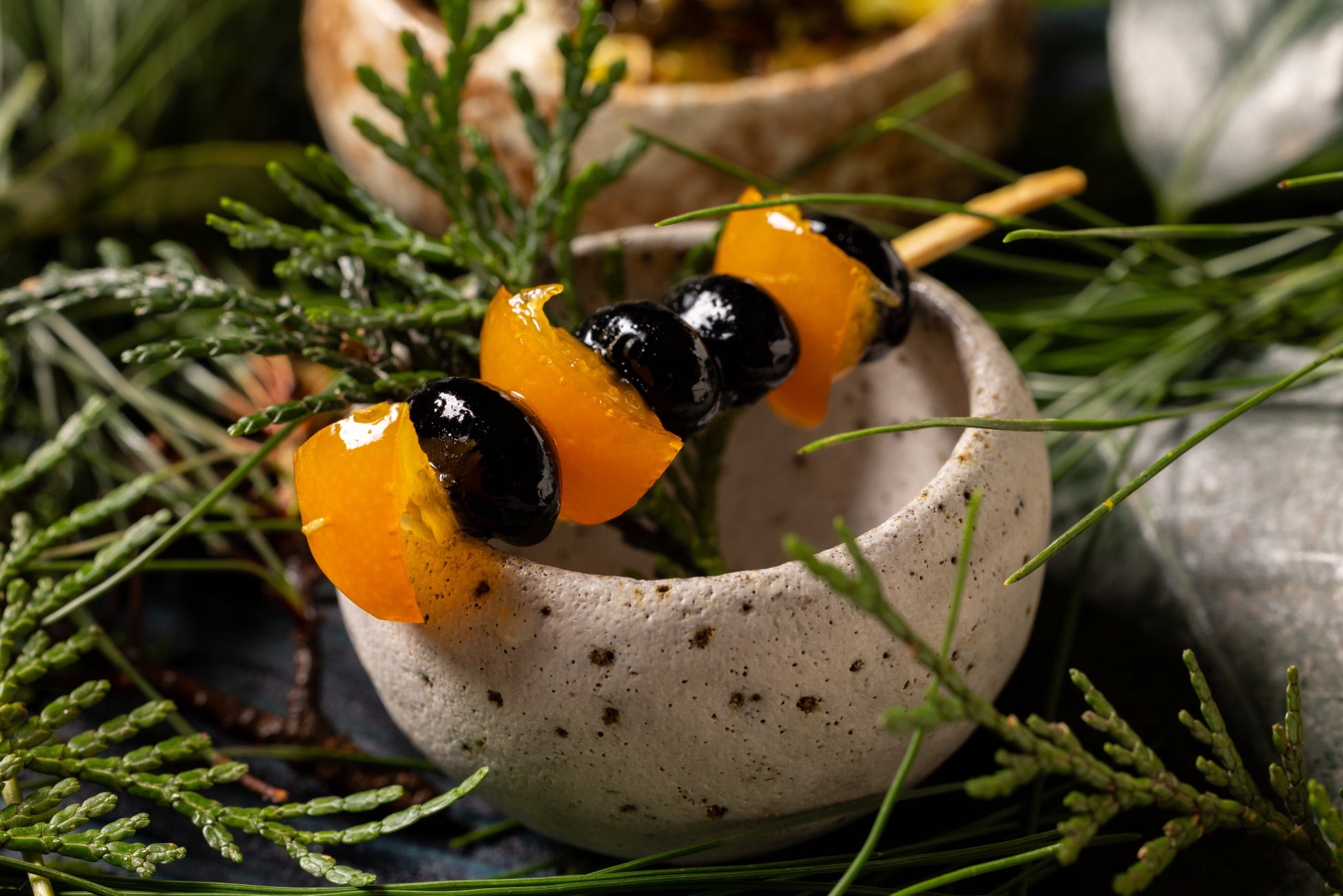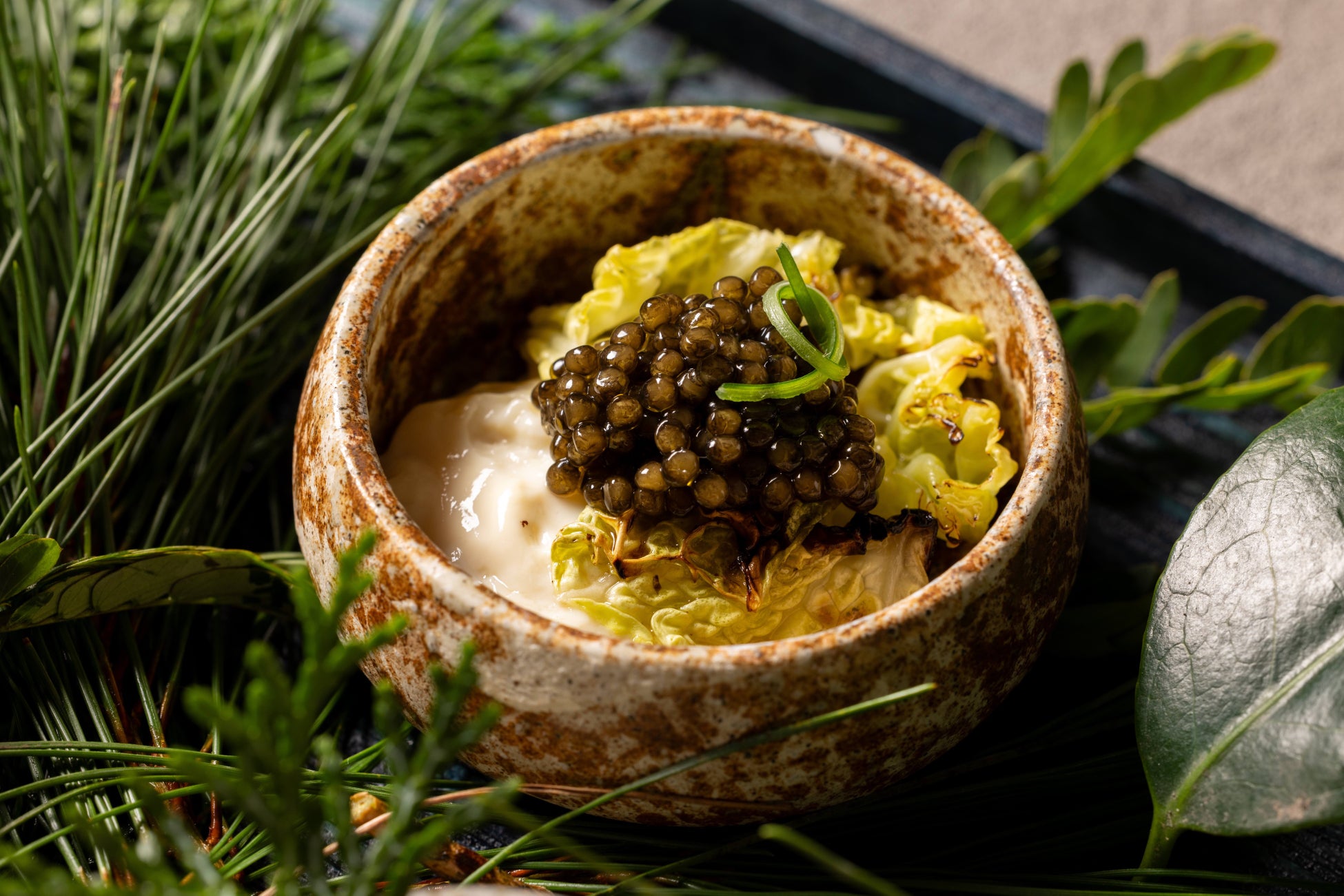 「フェスティブメニュー2024-2025」は、ランチで6品、ディナーで10品のコース料理をご用意。キャビアと燻製豆乳、黒豆煮とキャンディー状に仕上げたキンカンの串、鮟肝をキャラメリゼし炭火で焼き上げたカボチャとライ麦のビスキュイと共に味わう3品を一皿にまとめた前菜を提供。その他、ハマチのクルードや冬野菜、ズワイガニと柑橘類を使ったフレッシュな料理、鴨肉の「トルテリーニ・エン・ブロード」やイノシシのコンフィなど、季節の温かみを感じられる料理が続きます。プレデザートには甘酒とイチゴのボンボン、最後のデザートには柚子カスタードを添えたスパイスパブロバをご用意し、冬の華やかさを感じる甘美な余韻で締めくくります。さらに、チョコレートと黒ゴマのクランチと共に、コーヒーまたは紅茶もお楽しみいただけます。この「フェスティブメニュー2024-2025」は、シェフの創造力が光る美しい料理の数々で、五感で味わう食の旅へとお客様を誘います。
