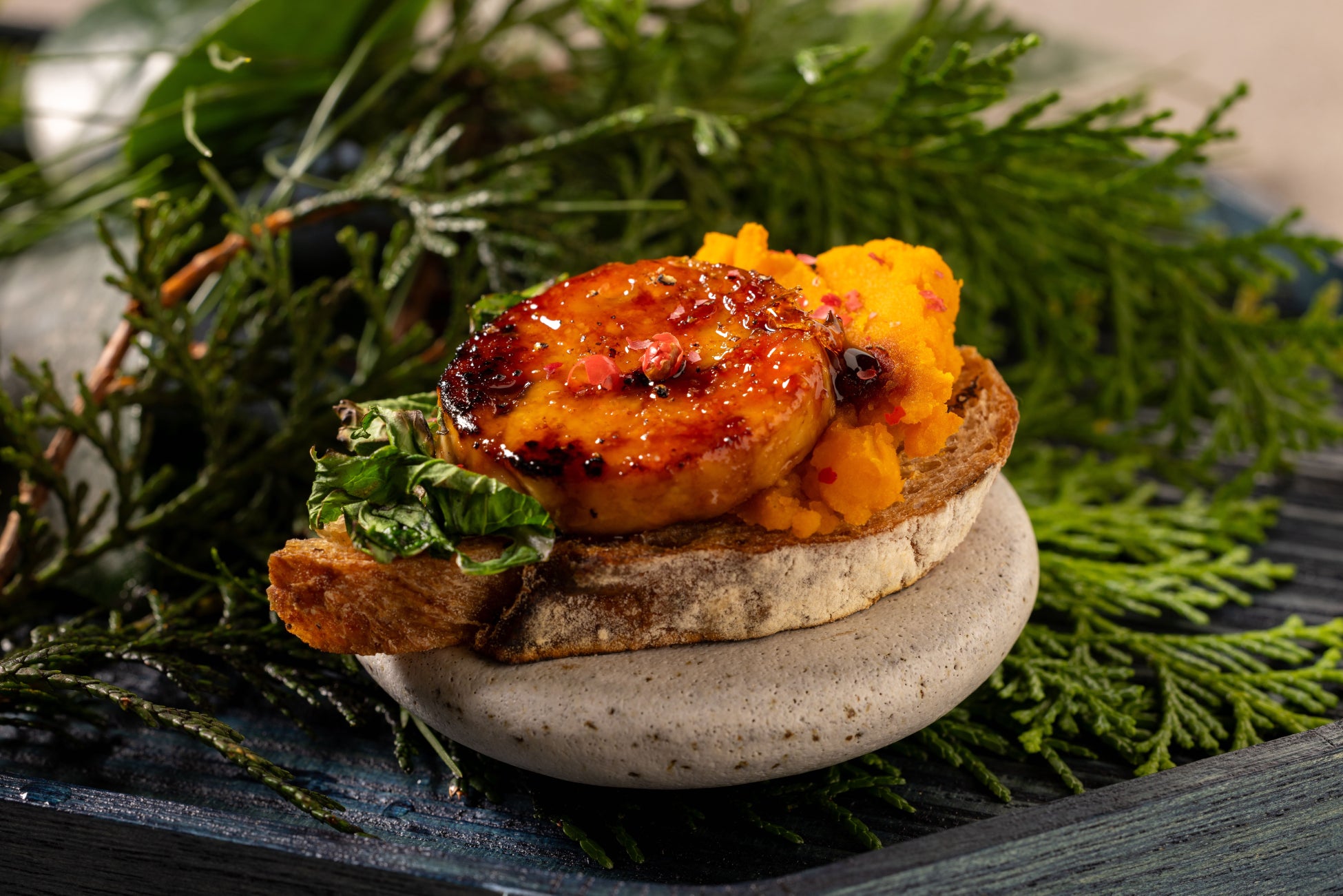 - 鮟肝キャラメル、カボチャ添えライ麦ビスキュイ