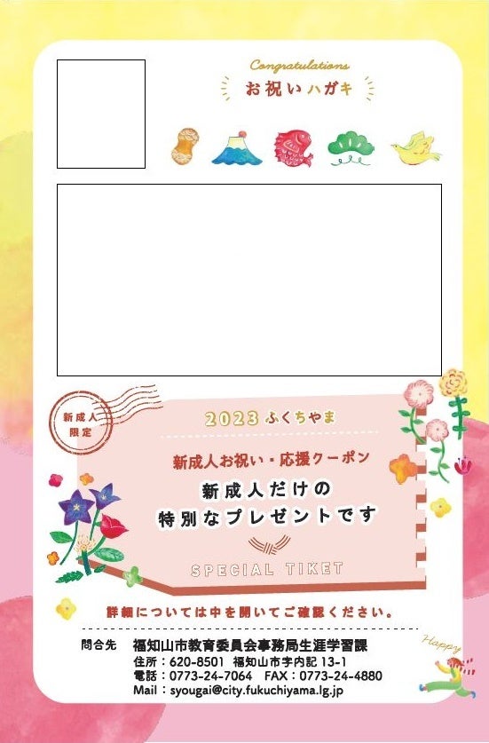 新成人の皆様には、このはがき・チラシを通して、福知山市を挙げてお祝い・応援する思いを受け取っていただき、成人としての自覚や責任をもち、地元への関心を高めていただく機会にしていただければと思います。