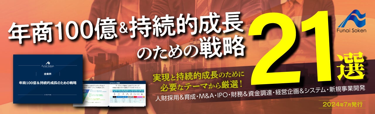 中堅・中小企業を対象に専門コンサルタントを擁する経営コンサルティング会社の株式会社船井総合研究所(本社:大阪府大阪市、代表取締役社長:真貝大介、以下、船井総合研究所)は企業経営者を対象に、企業が年商100億円に達成し、その後持続的に成長していくためのポイントをまとめたレポートを公開しました。本レポートは、特設サイトより無料でダウンロードをしていただけます。